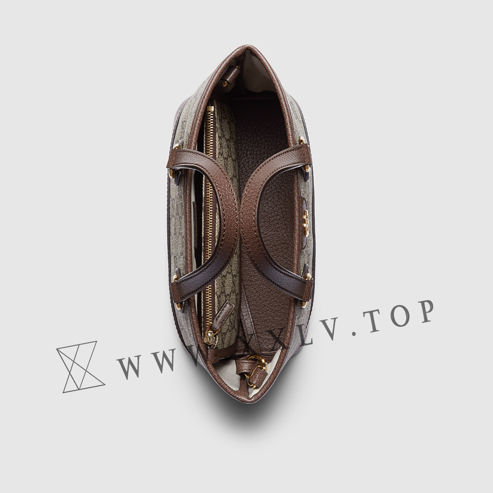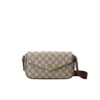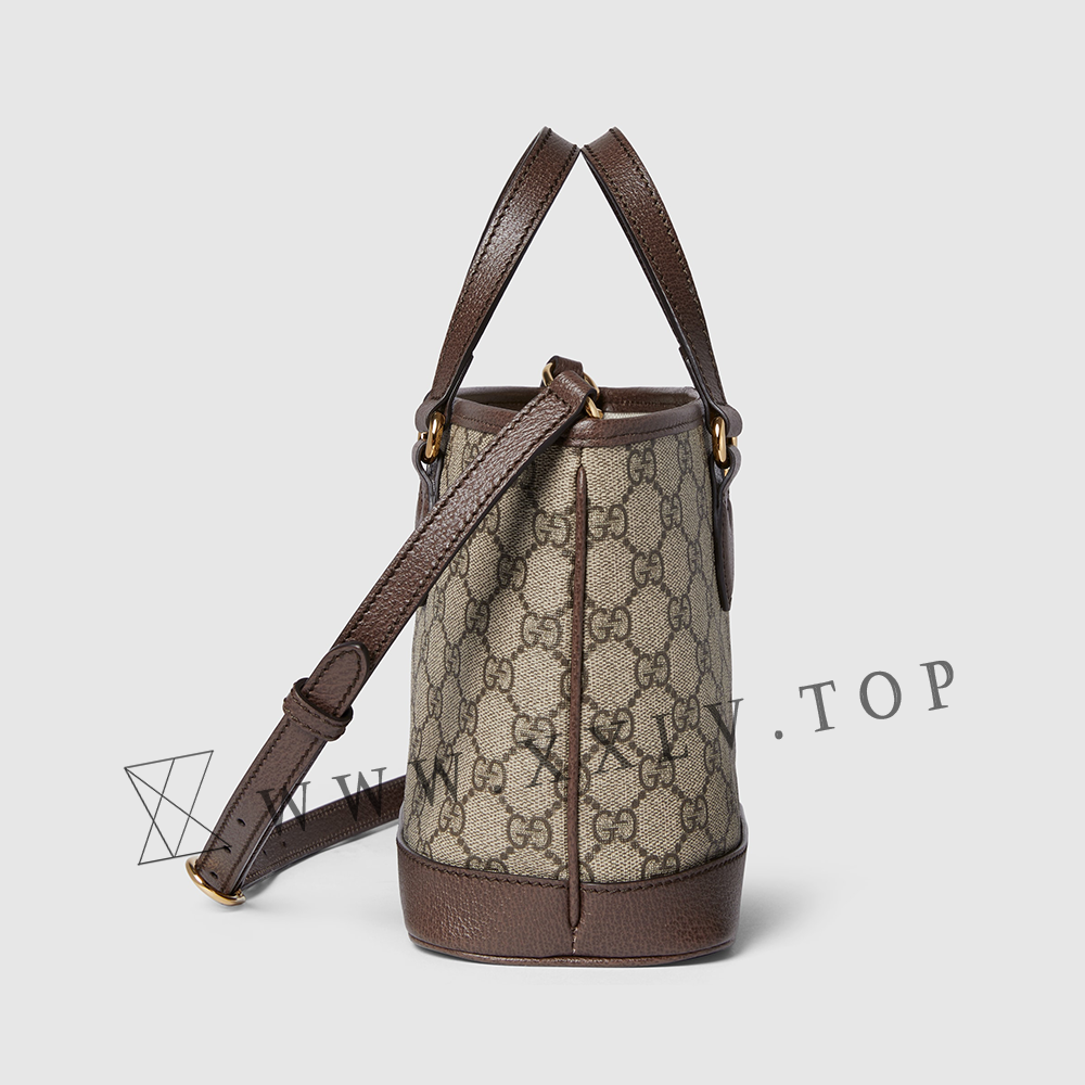 The Ophidia line is further elevated through new sizes and styles, like this mini tote bag which has a detachable pouch and detachable leather shoulder strap, allowing for versatile wear. The beige and ebony GG Supreme canvas is complete with light gold-toned Double G hardware.