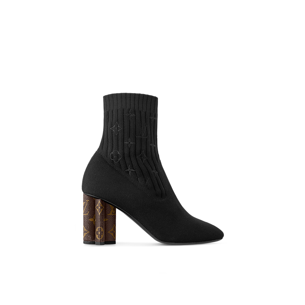 One of Louis Vuitton’s most emblematic styles, the Silhouette ankle boot is revisited in black stretch textile, which provides a second-skin fit. The signature of the Silhouette line is its heel, which is shaped like a Monogram Flower and covered in patent Monogram canvas. This model features a padded insock for enhanced comfort.