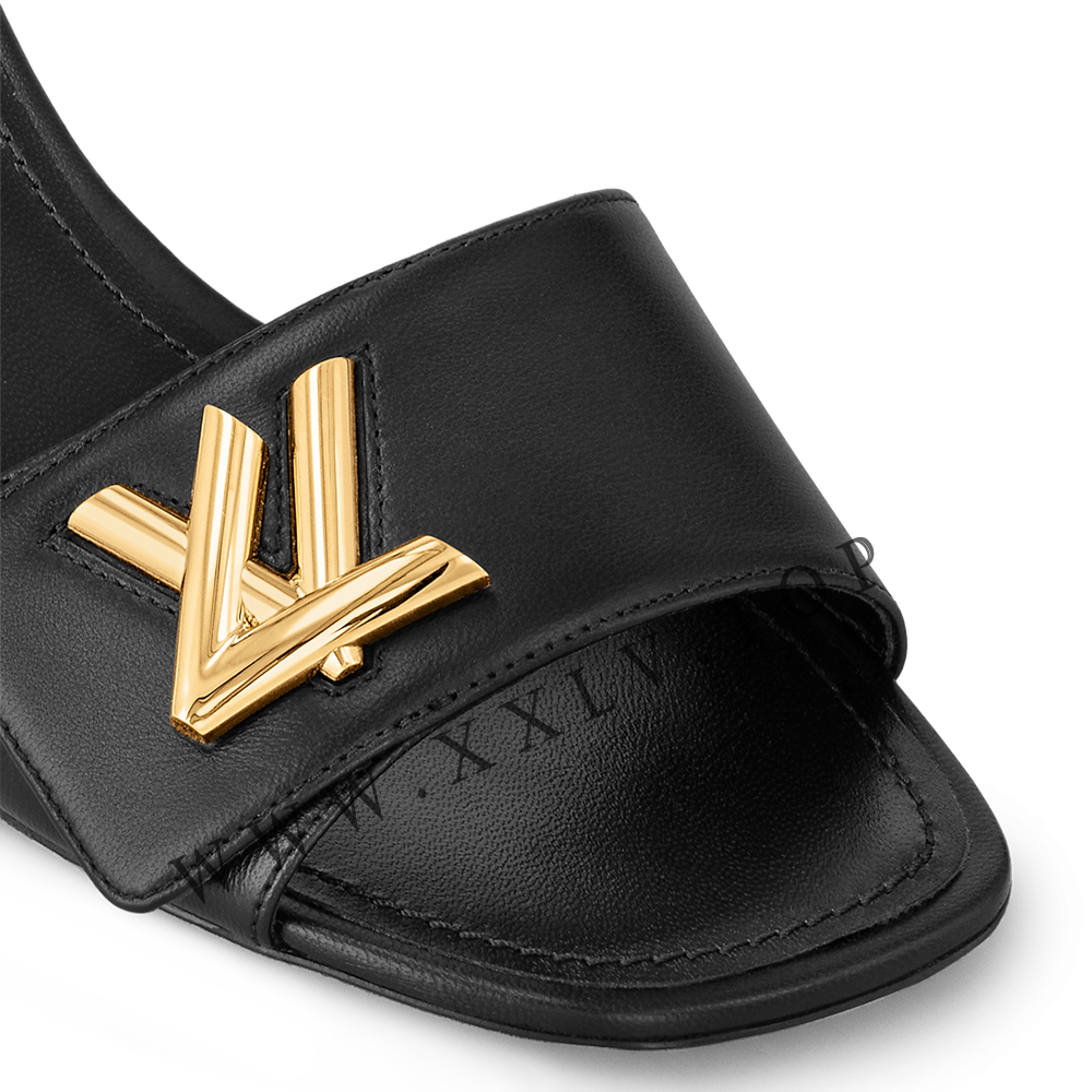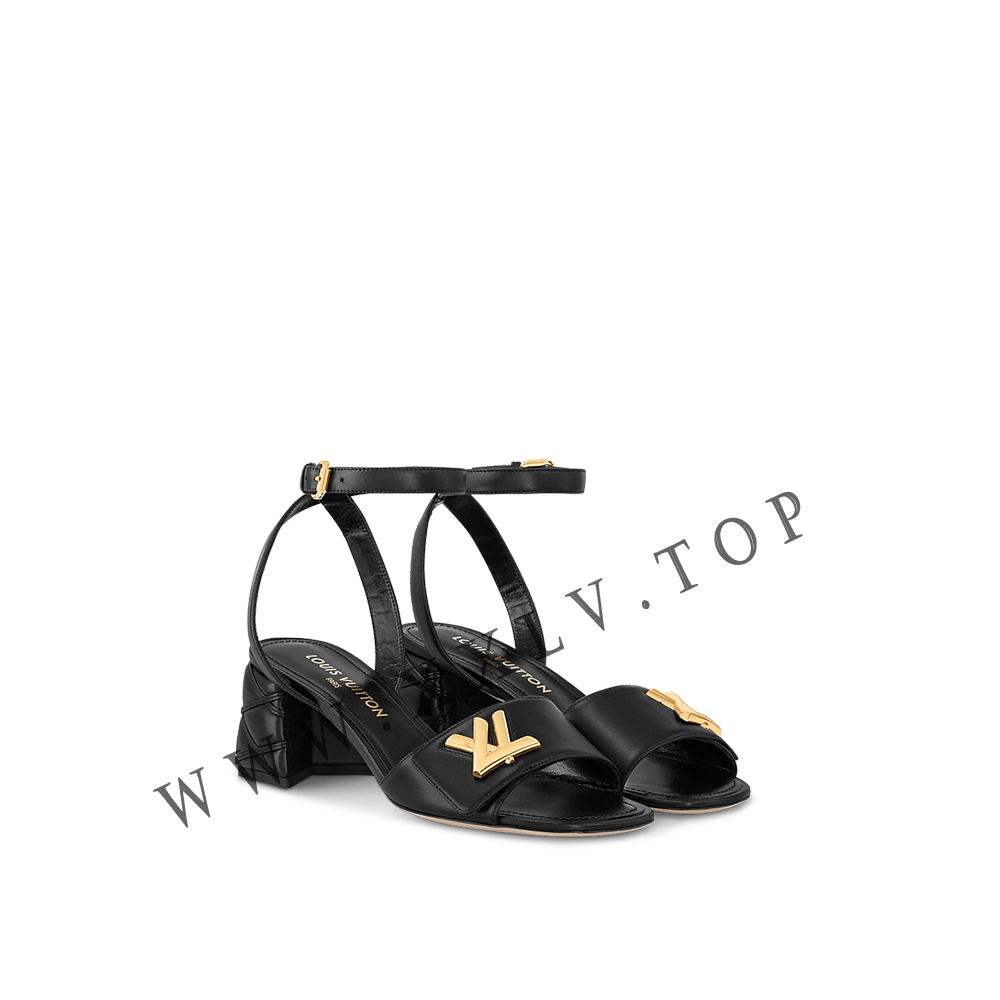 The Shake sandal in supple lambskin combines two distinctive signatures: a chunky LV accessory on the front strap, which references the clasp of the iconic Twist bag, and a crisscross Malletage pattern on the block heel, evoking the lining of Louis Vuitton trunks. A slender ankle strap with a tiny, gold-tone buckle completes this feminine model.