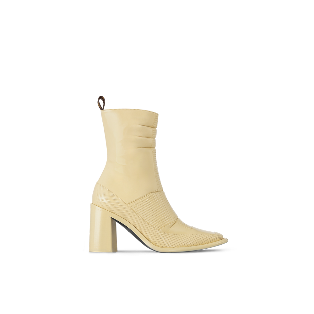 The Berlin ankle boot closed Nicolas Ghesquière’s 10th anniversary fashion show for Louis Vuitton with a spectacular array of rainbow shades. This retro-futuristic model is crafted from hand-colored calf leather and embellished with quilted and perforated details inspired by biker jackets. It is finished with a sturdy block heel.