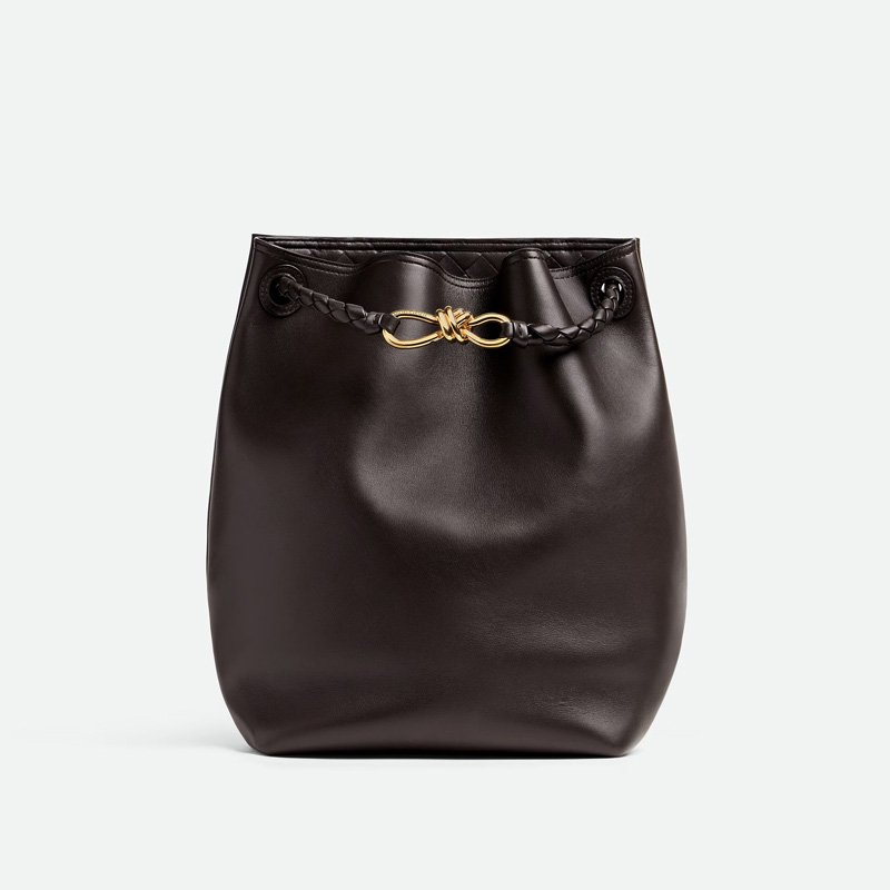 Bucket bag in silky calf leather with signature knot detail and sliding shoulder strap.