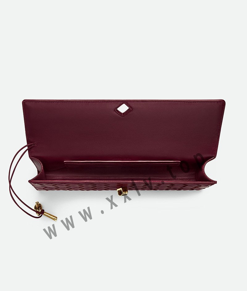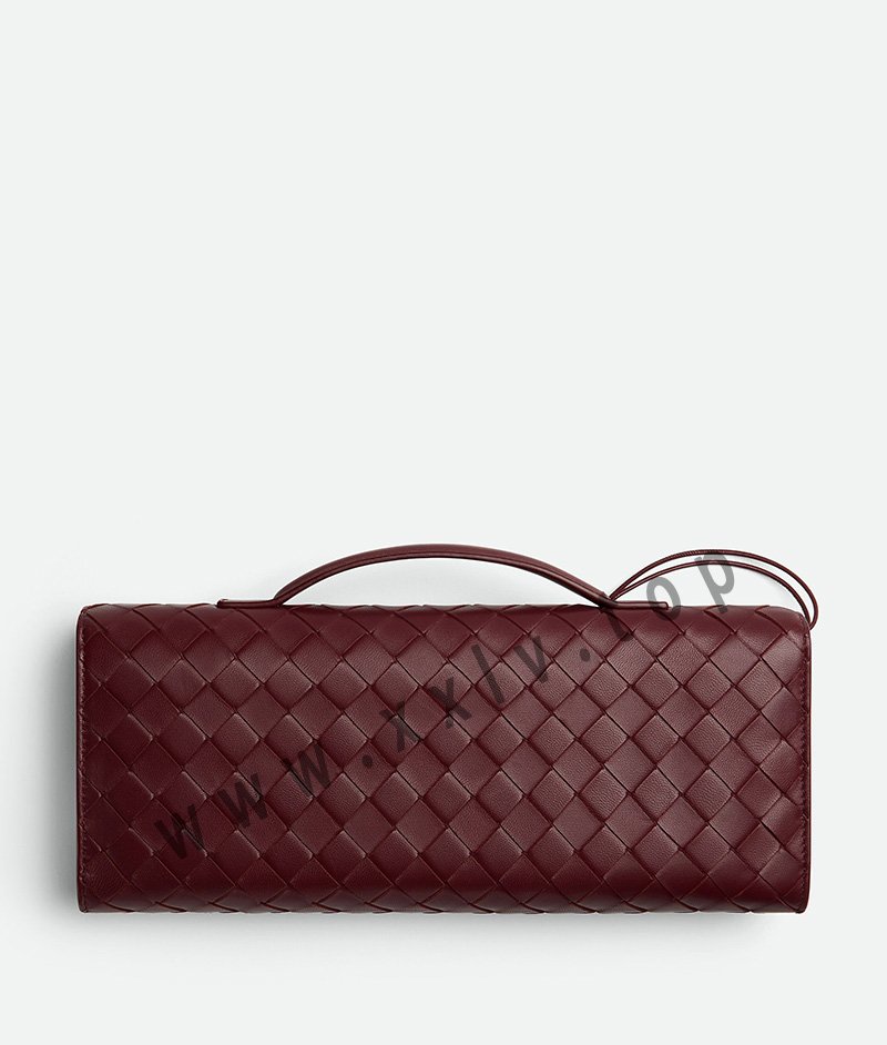 Top handle clutch in supple Intrecciato leather with signature knot closure.