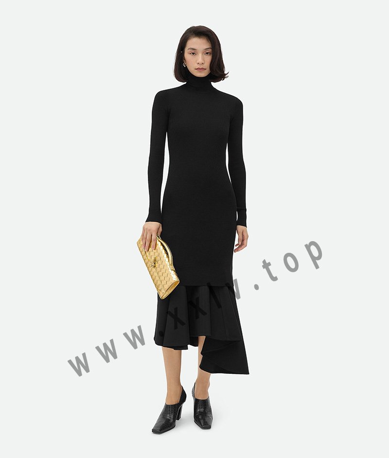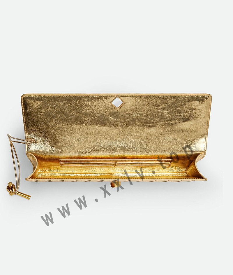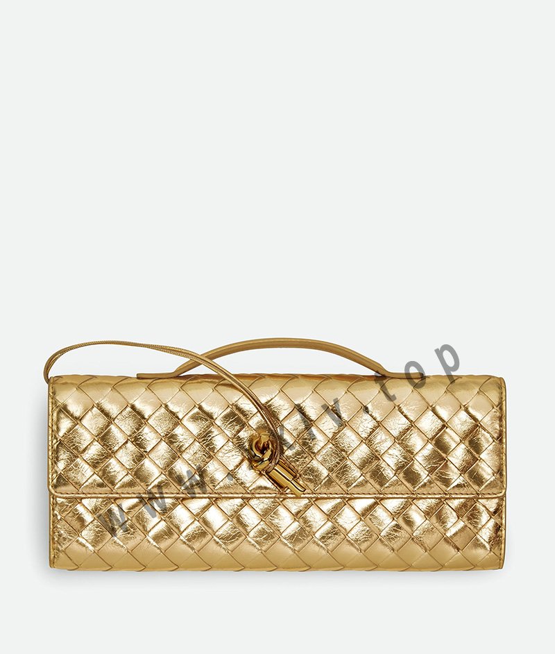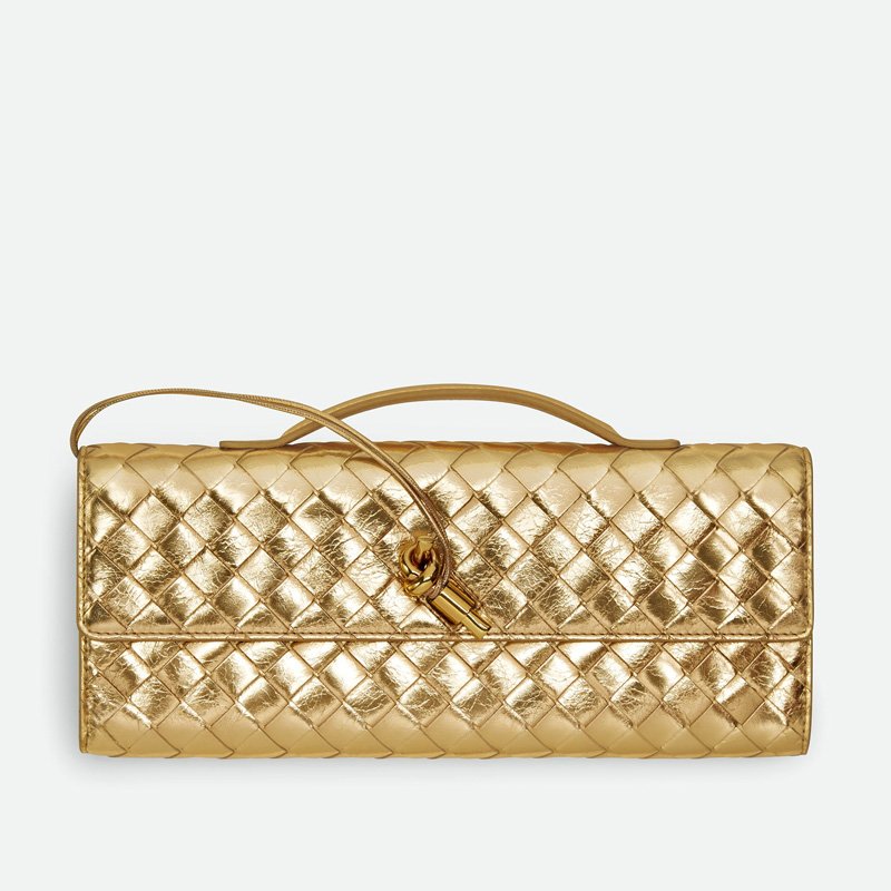 Top handle clutch in supple Intrecciato leather with signature knot closure.