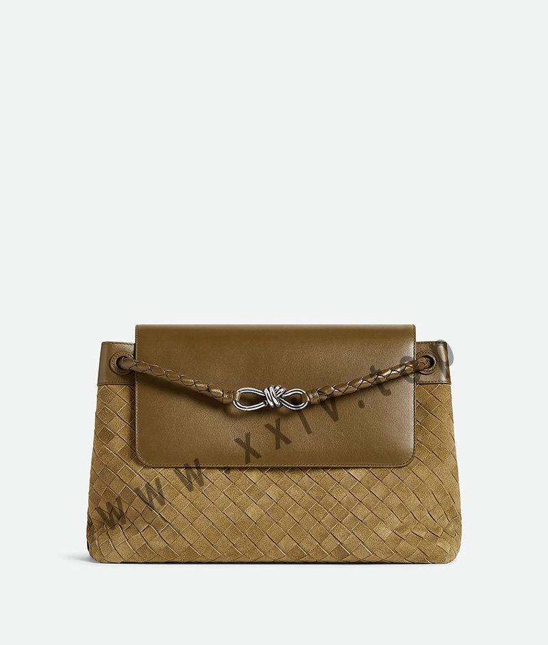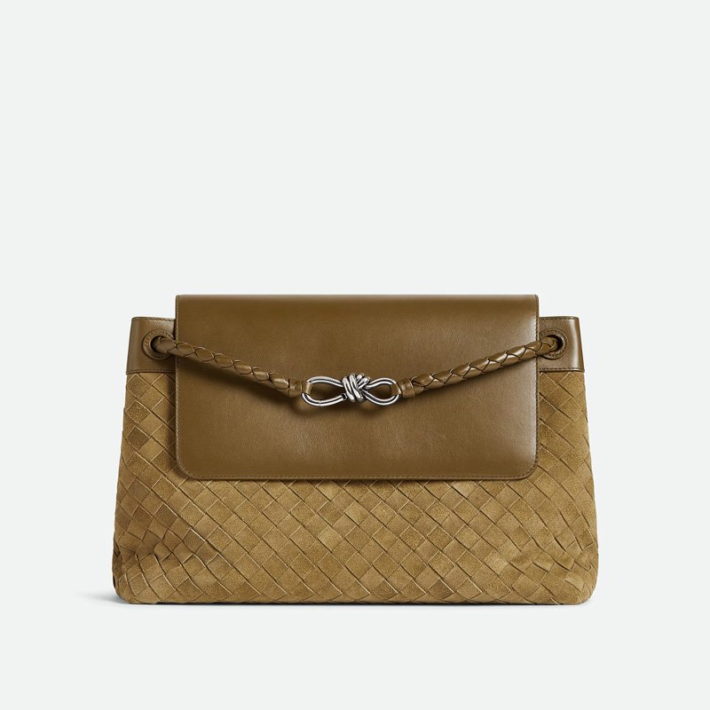 Messenger in Intrecciato leather with signature knot detail featuring an adjustable and detachable cross-body strap.