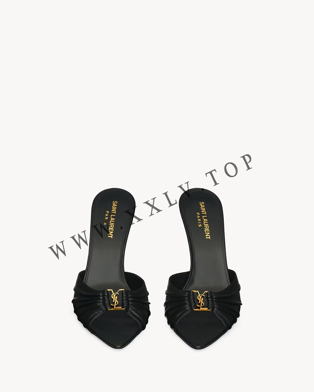 stiletto mules with a pointed peep toe and gathered upper decorated with the CASSANDRE.