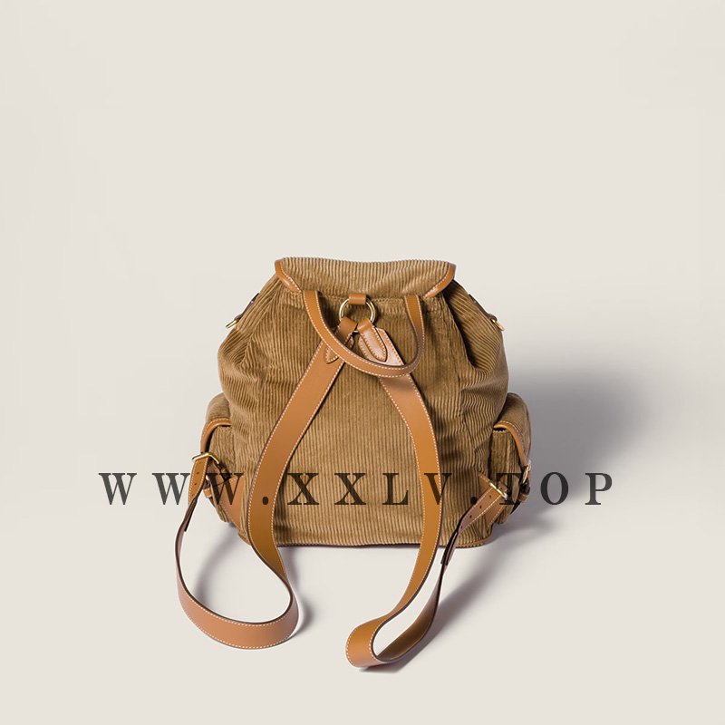 Vintage references and elegant contemporary functionality define the style of the Miu Miu backpack, embellished with a multi-pocket design, leather trim, and the refined texture of corduroy.
