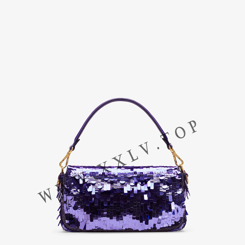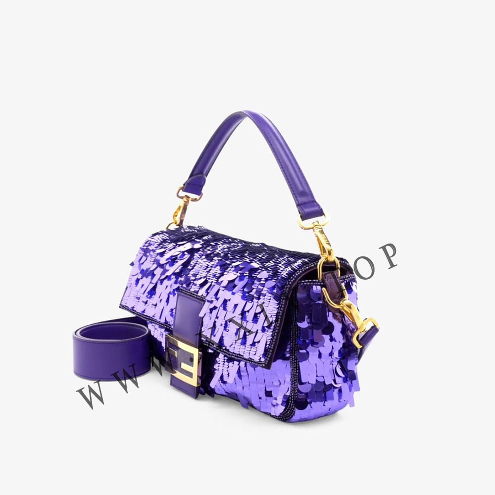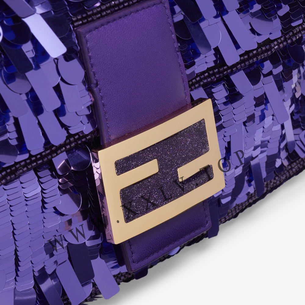 Iconic medium Baguette bag finely embroidered all-over with purple sequins of different shapes and sizes to create a 3D effect and decorated with an FF clasp. This style is a re-release of the original version first introduced in the Autumn/Winter 1999-2000 Collection. Features a front flap, tone on tone leather details and magnetic clasp. Internal compartment with zip pocket and gold-finish metalware. The bag can be carried by hand, or worn either on the shoulder or cross-body thanks to the leather handle and shoulder strap, both detachable.