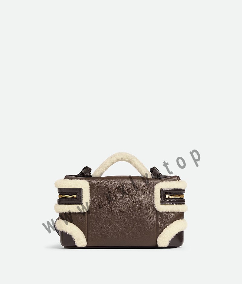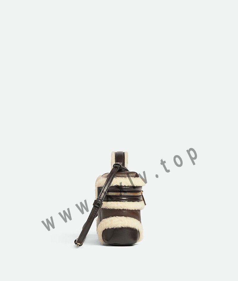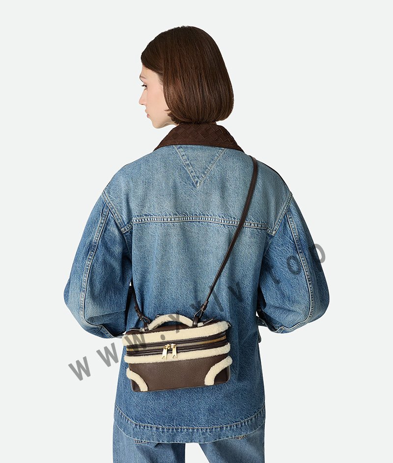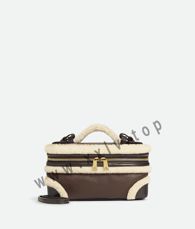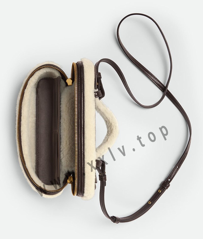 Vanity case in aviator merino shearling with detachable strap.