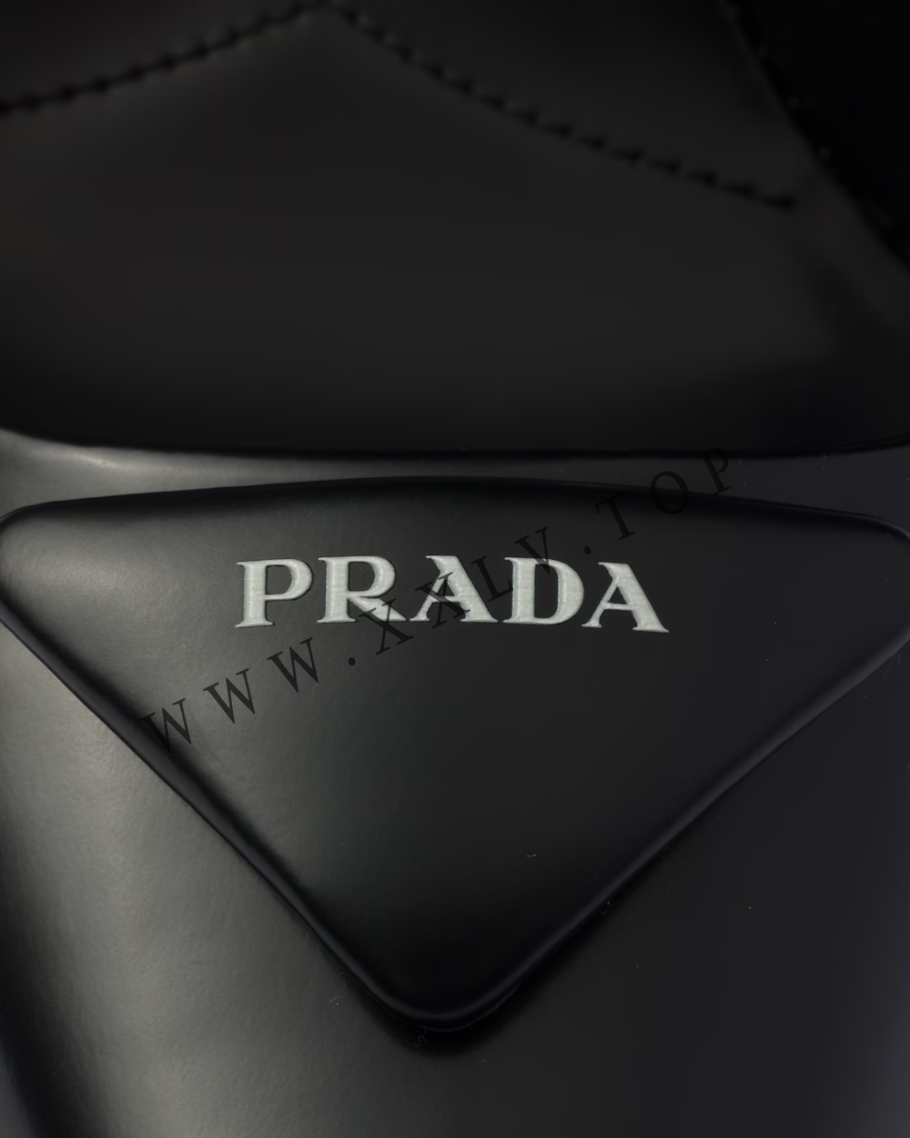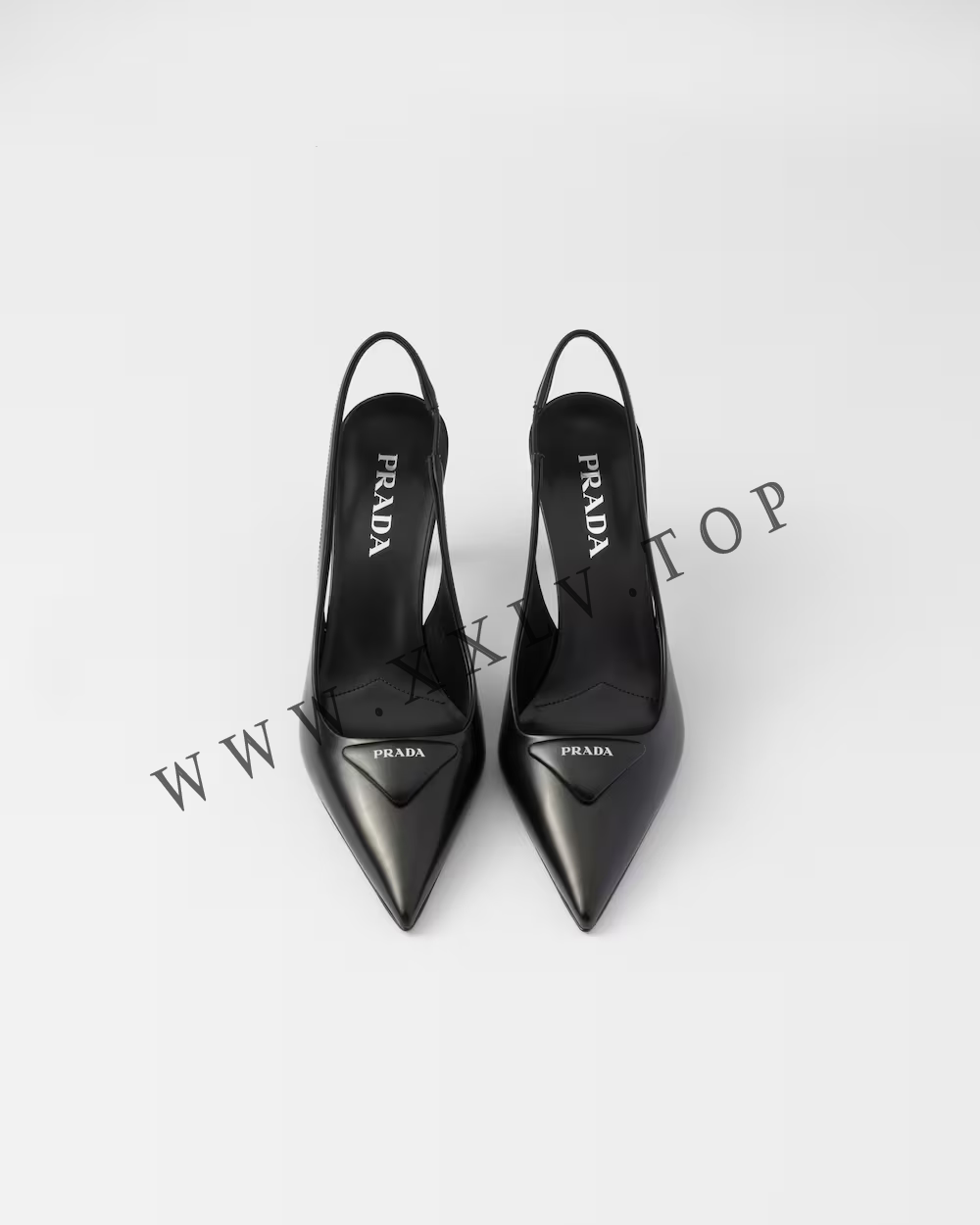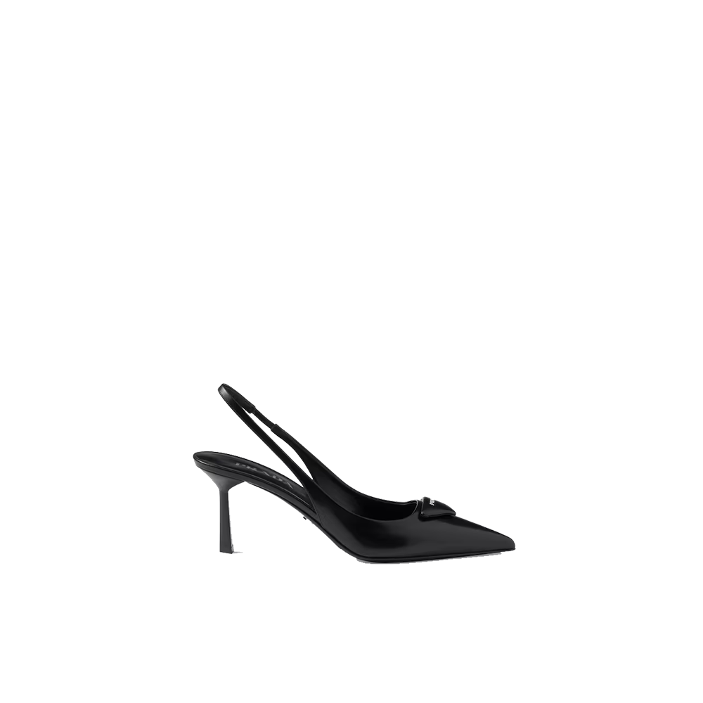 These pumps expressing sophisticated, feminine elegance are made of brushed leather, an emblematic material of Prada since the 90s traditionally used for luxury footwear. The triangle logo returns as a slightly padded leather detail and inspires the geometric line of the heel, which gives the silhouette a modernist note.