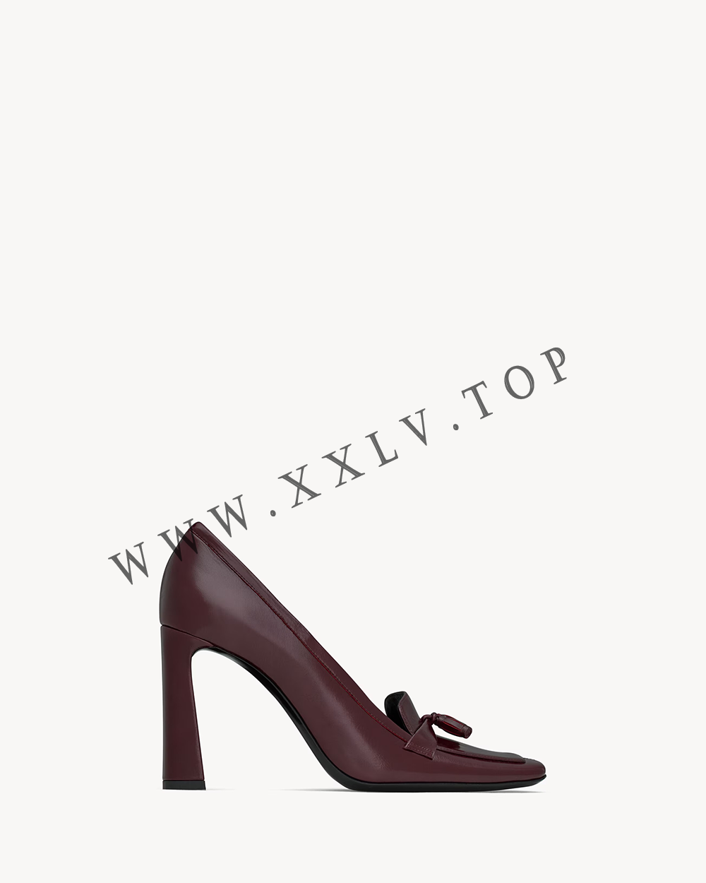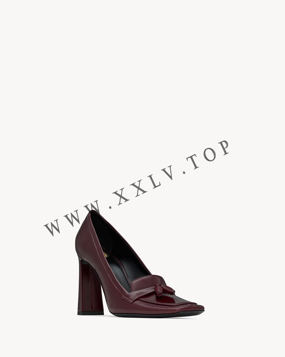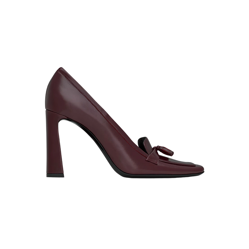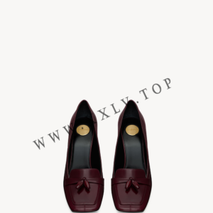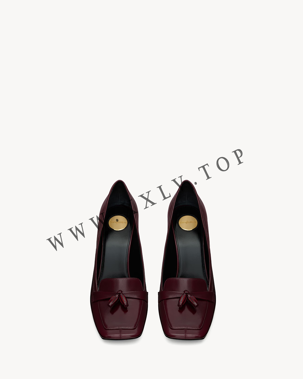 tassel loafer pumps with a square apron toe and covered flared block heel.