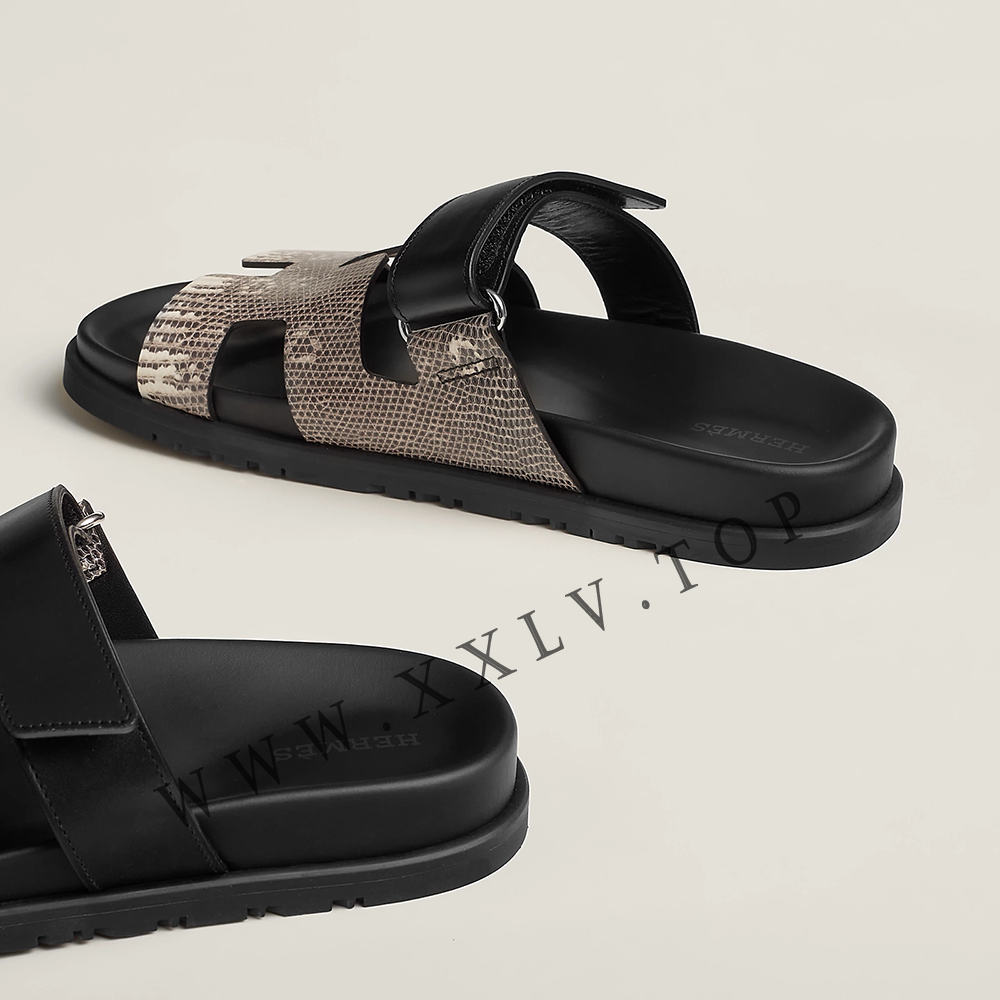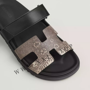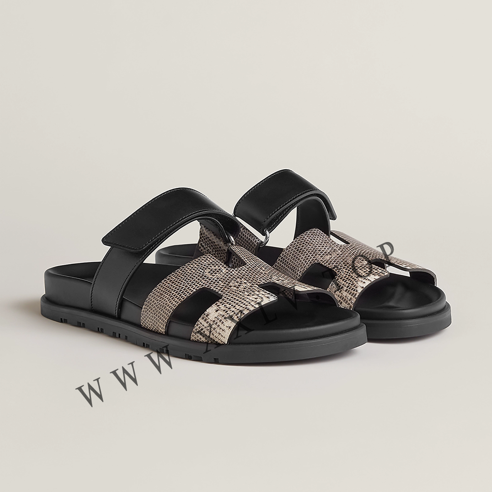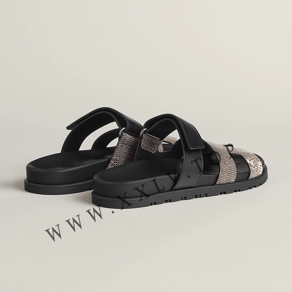 Techno-sandal in Natura lizard and calfskin with anatomical rubber sole and adjustable strap.