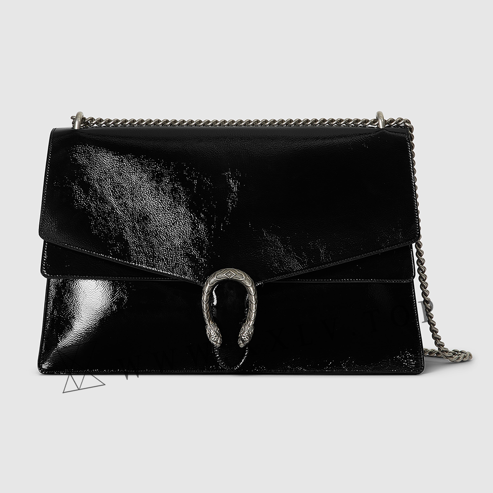 Gucci’s Creative Director Sabato de Sarno presents a maxi version of the signature Dionysus shoulder bag. Designed with a more contemporary look, this iteration in sleek black patent leather features a tiger head closure with a flap and a sliding chain that can be adjusted to wear with the preferred length and style.