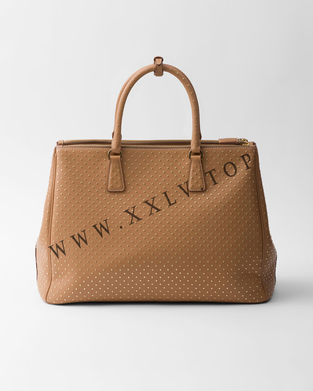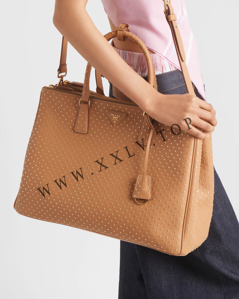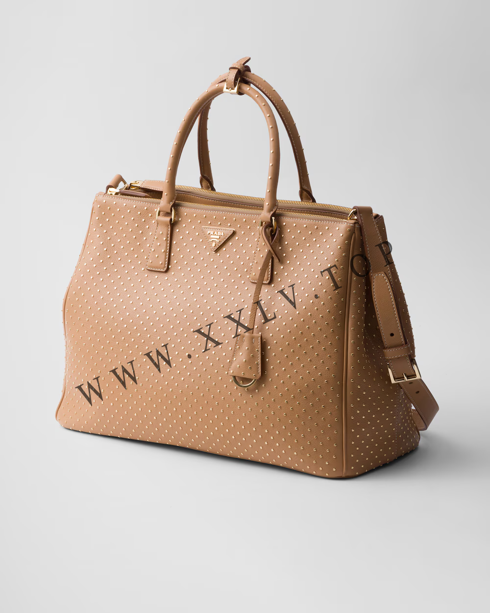 The elegant and versatile Prada Galleria bag blends industrial precision and refined, meticulous workmanship in a clean and sophisticated leather design. Composed of over 80 separate pieces assembled by hand, the three-compartment style reveals a multifaceted and universal nature that makes it the perfect canvas for always new interpretations. The three-compartment silhouette, presented in an extra-large version, is decorated with metal studs applied all-over, which give character and uniqueness to the iconic accessory.