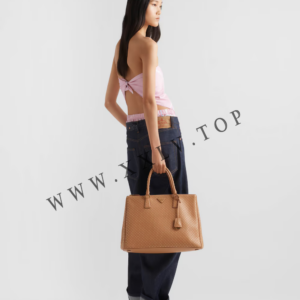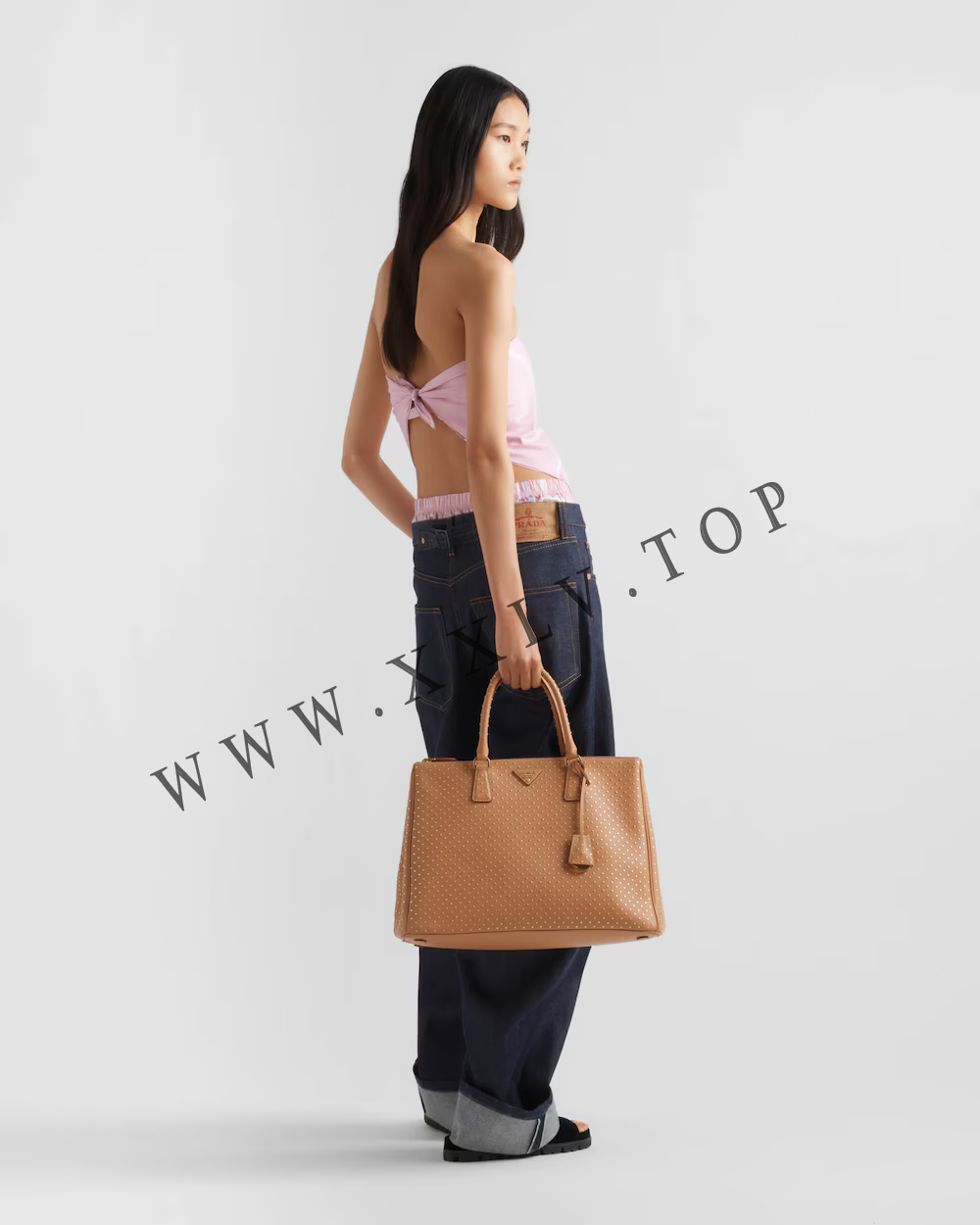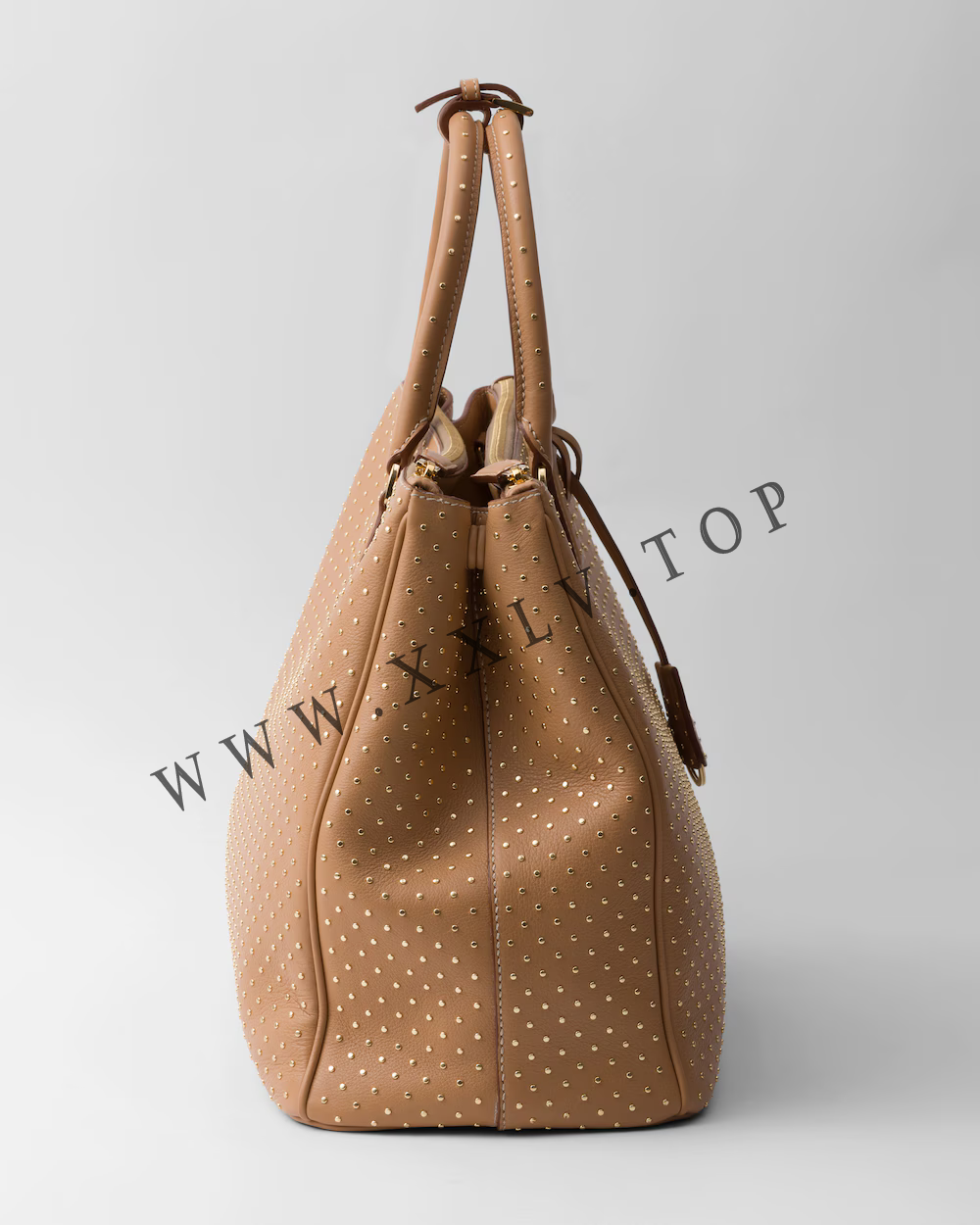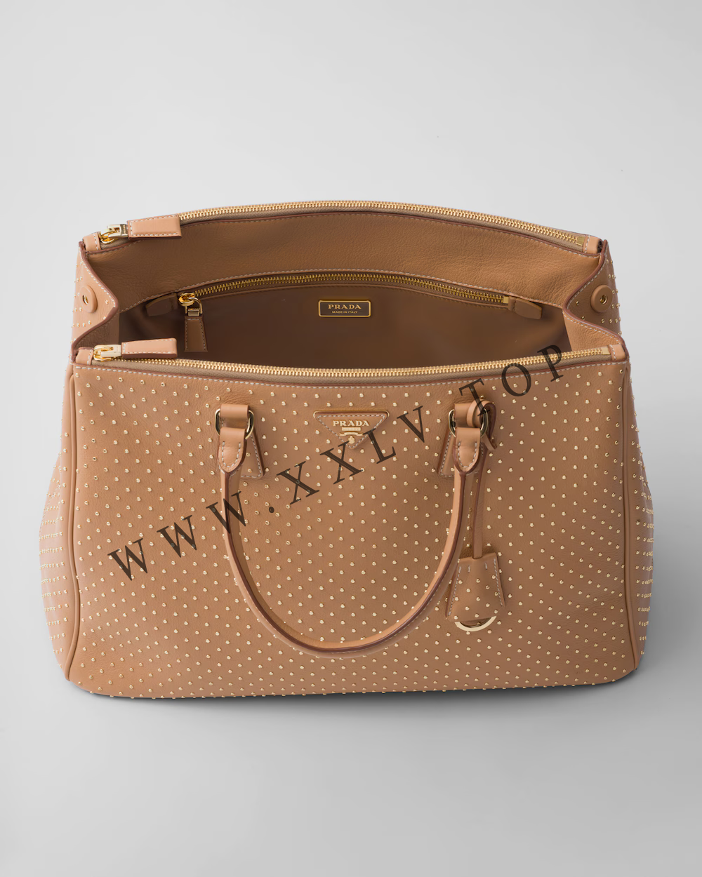 The elegant and versatile Prada Galleria bag blends industrial precision and refined, meticulous workmanship in a clean and sophisticated leather design. Composed of over 80 separate pieces assembled by hand, the three-compartment style reveals a multifaceted and universal nature that makes it the perfect canvas for always new interpretations. The three-compartment silhouette, presented in an extra-large version, is decorated with metal studs applied all-over, which give character and uniqueness to the iconic accessory.