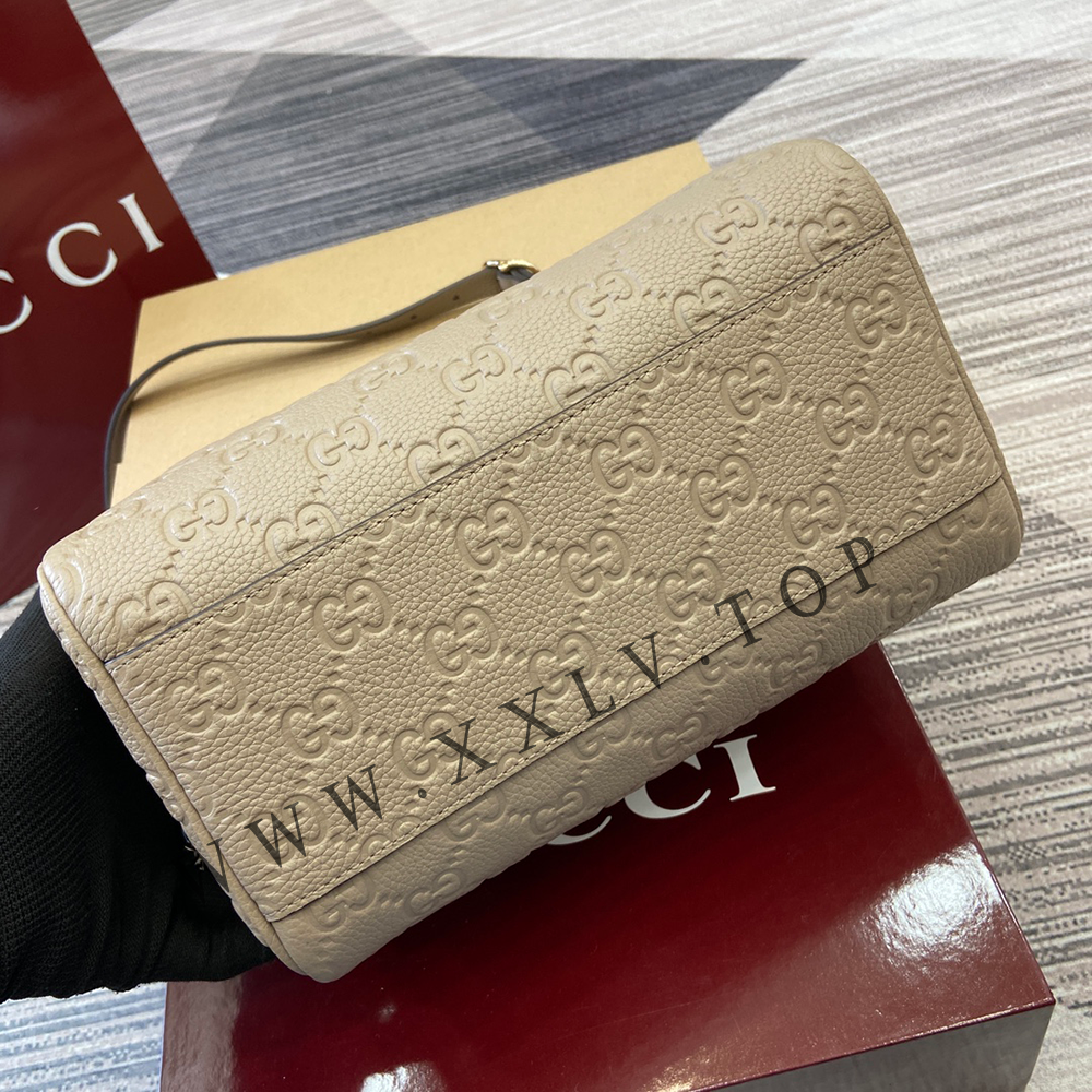The new GG Emblem collection reinterprets the House’s history of elegance and craftsmanship. This small top handle bag has two zippers for easy access, and a light gold-toned chain and leather shoulder strap for crossbody wear.