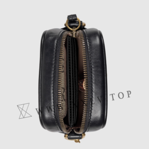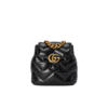 Crafted from black matelassé leather, the mini bag has a vertical design with a zipper closure and interior card slots. Part of the GG Marmont collection, the chain strap bag is defined by the emblematic Double G hardware—a contemporary take on a Gucci archival belt buckle from the ’70s that has become a hallmark of the House.