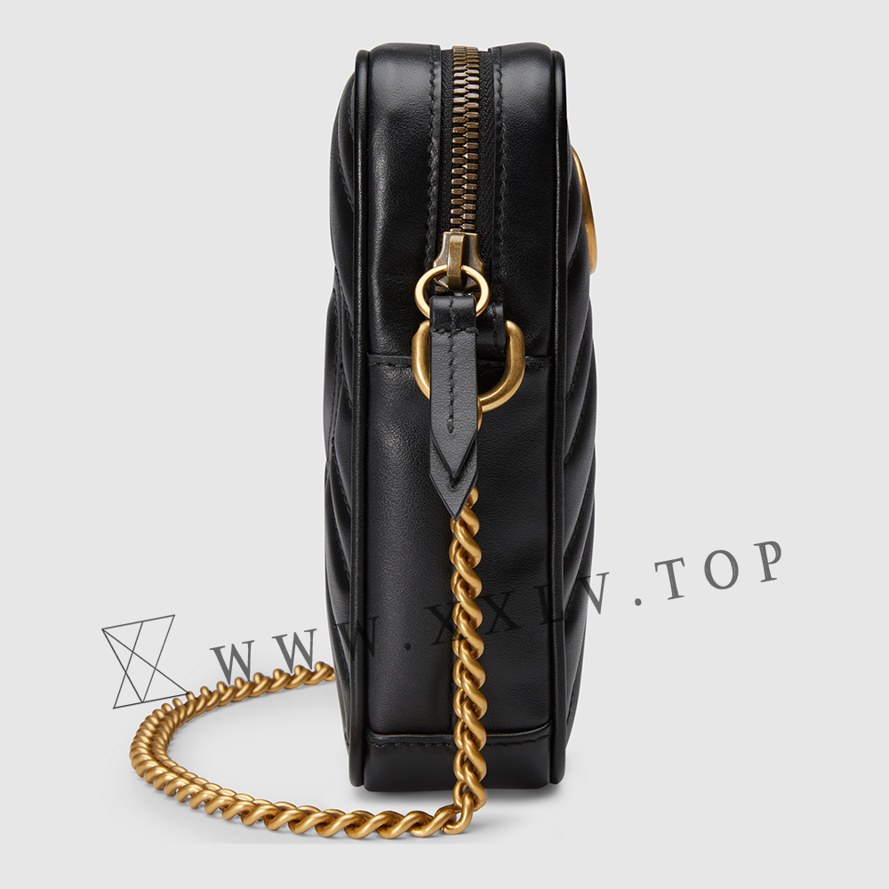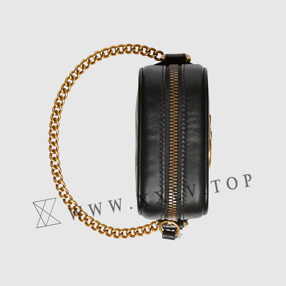 Crafted from black matelassé leather, the mini bag has a vertical design with a zipper closure and interior card slots. Part of the GG Marmont collection, the chain strap bag is defined by the emblematic Double G hardware—a contemporary take on a Gucci archival belt buckle from the ’70s that has become a hallmark of the House.