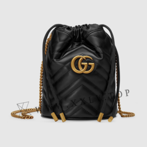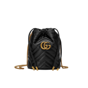 A mini bucket bag presented in white matelassé leather with a heart detail on the back. The GG Marmont collection is defined by the emblematic Double G hardware—a contemporary take on a Gucci archival belt buckle from the ’70s that has become a hallmark of the House. Completed by a gold-toned chain strap, the dynamic shape can be worn in multiple ways.