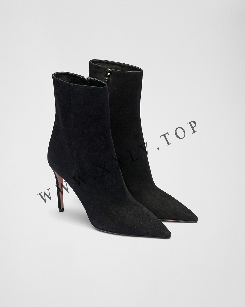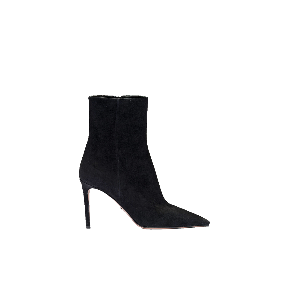 These elegant, feminine suede booties are characterized by the pointy toe and the spike heel. The iconic metal lettering logo embellishes the leather sole.