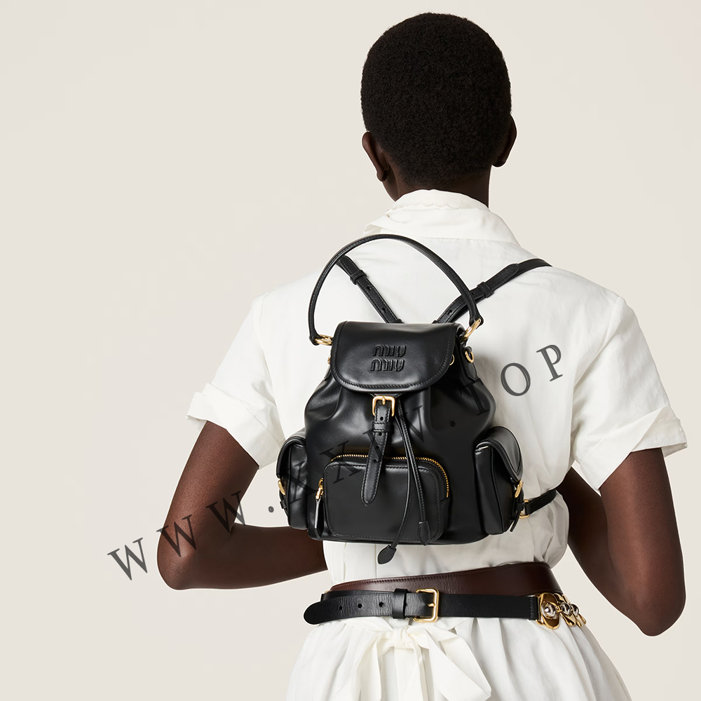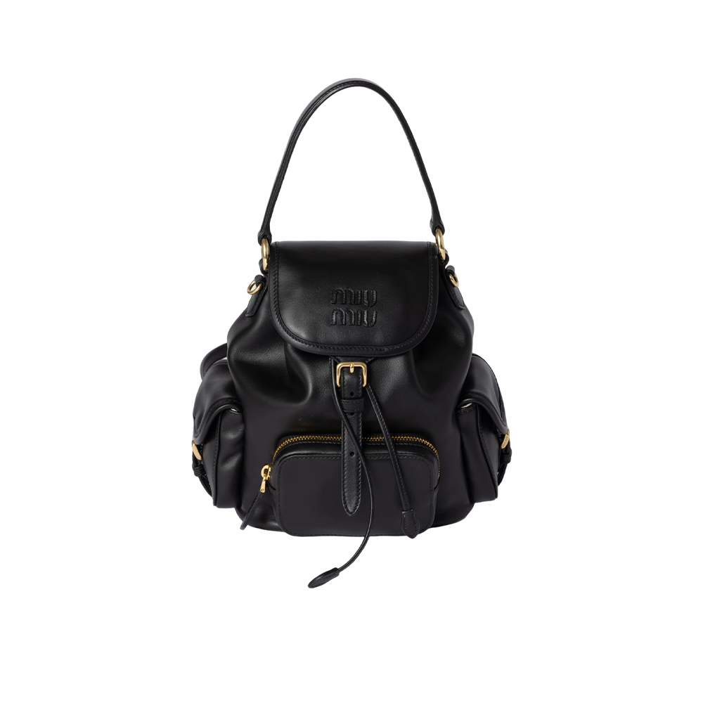 This leather backpack inspired by school gear combines artisan appeal and a casual attitude. The multi-pocket design and the option of wearing it as a crossbody bag express the contemporary and playful spirit of Miu Miu bags.