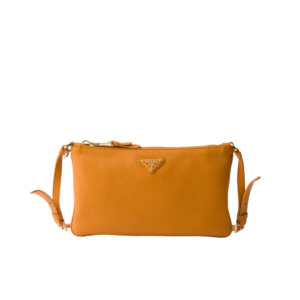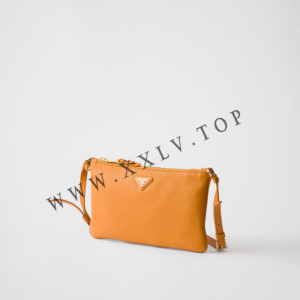 Zipper closure–Enameled metal triangle logo–Adjustable leather handle–Logo-print nylon lining with zipper pocket