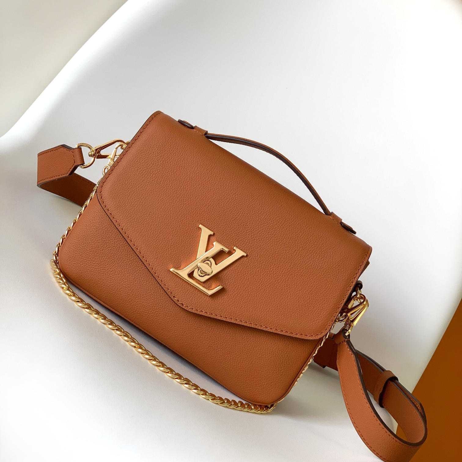 The sleek Oxford handbag in supple grained leather makes an ideal companion for daily life. With its sporty-chic attitude, this versatile model moves effortlessly from day to evening, with a detachable gold-finish chain for shoulder wear and an adjustable, removable leather strap for a hands-free, cross-body carry. The Lockme closure crafted from gleaming, gold-finish metal adds a stylish signature touch.