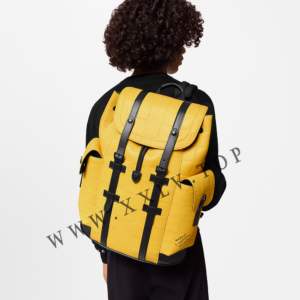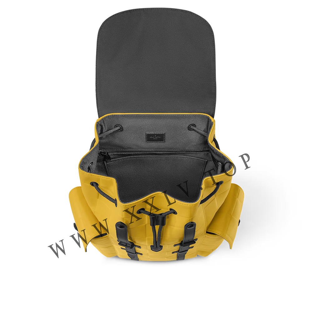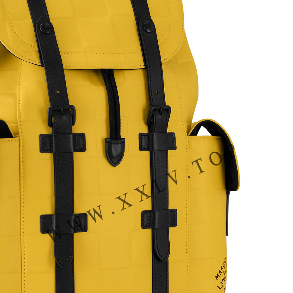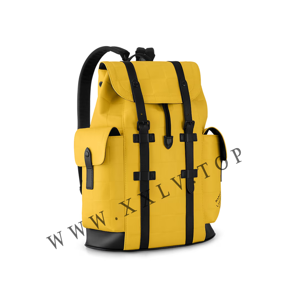 The Christopher MM backpack looks stunning in Pharrell Williams’ neoprene-yellow Damier Scuba calfskin leather, the perfect touch of vibrant color for a muted world. The black-leather trim and black-color hardware highlight the oversized Damier embossing. The Christopher’s classic rucksack design includes two roomy side pockets and snap and drawstring closure.
