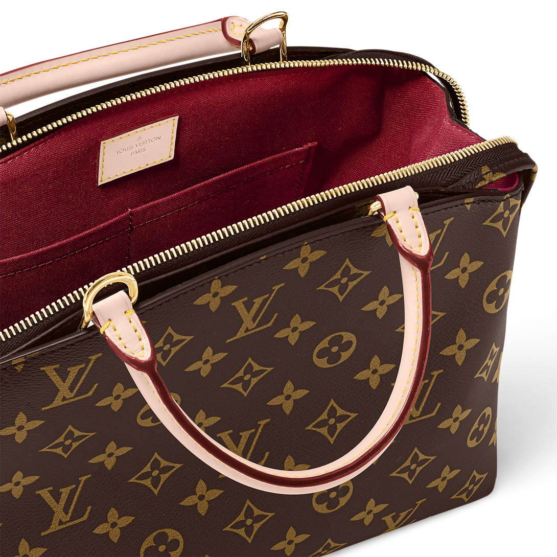 The timelessly feminine Petit Palais tote bag is made from Monogram canvas, trimmed with natural leather, and lined in a lush red textile. A removable and adjustable strap, in addition to Toron top handles, enables multiple carrying options. The gold-color padlock on the luggage tag evokes the House’s travel heritage.