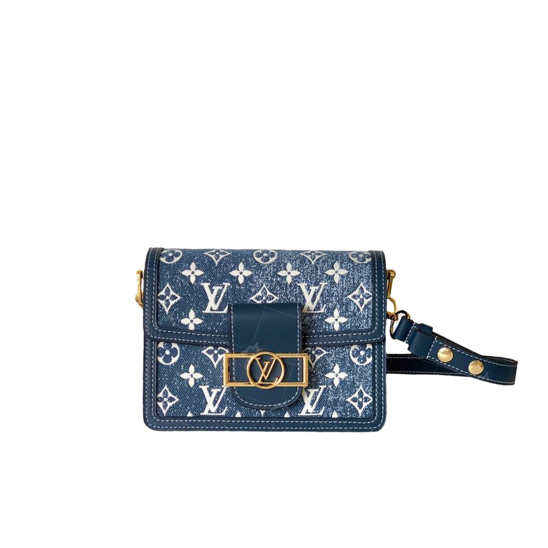M59716 denim blue model Dauphine small handbag is made of classic logo denim, which shows the unremitting pursuit of sustainable denim technology, and together with cow leather trim, it conveys the new retro flavor. Removable chains and inner compartments add functional details. Size: 20 x 15 x 9 centimeters (length x height x width)