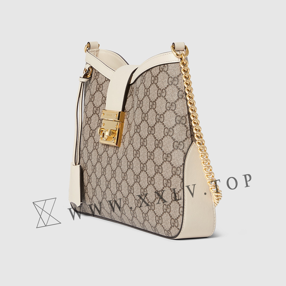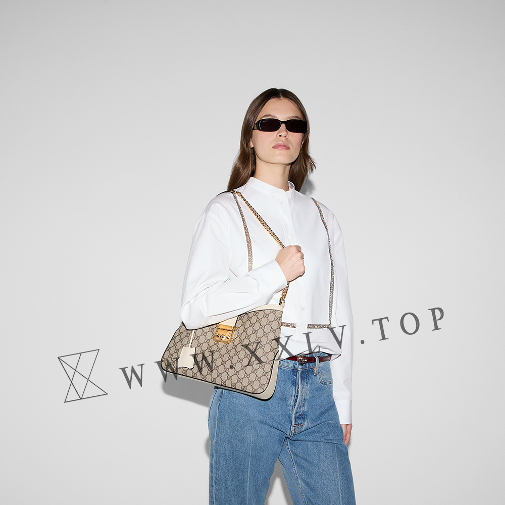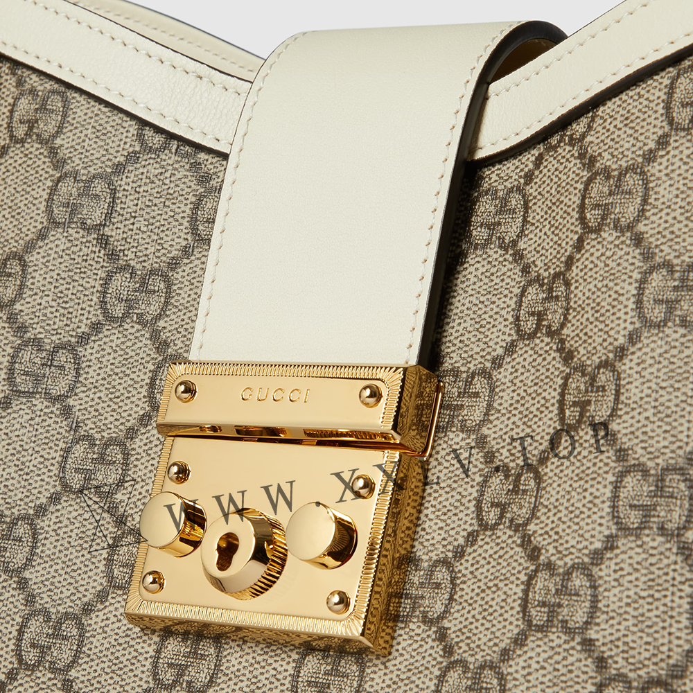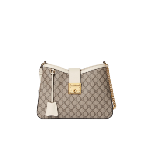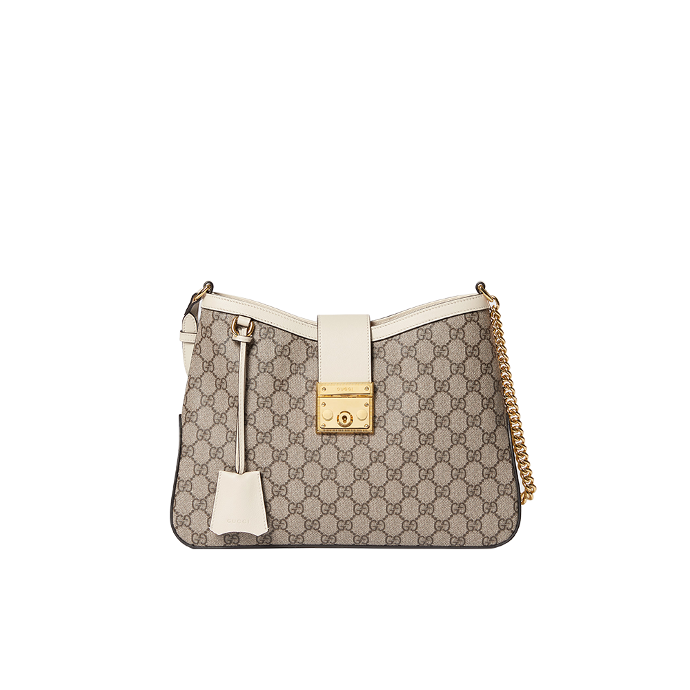 Drawing from the House’s origins as an artisanal luggage atelier, the Padlock closure features prominently on this shoulder bag in GG Supreme canvas. It is complete with gold-toned hardware, smooth white leather trim, a chain and leather shoulder strap.