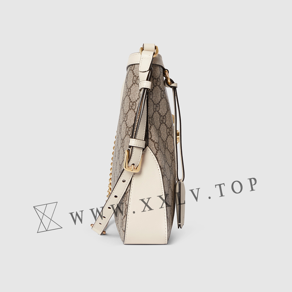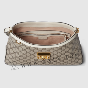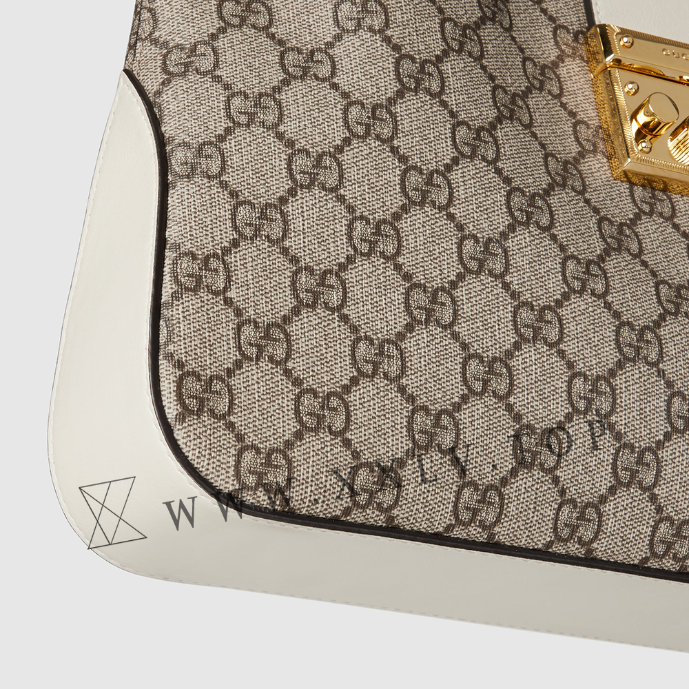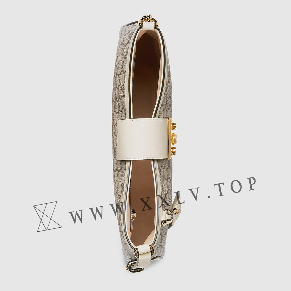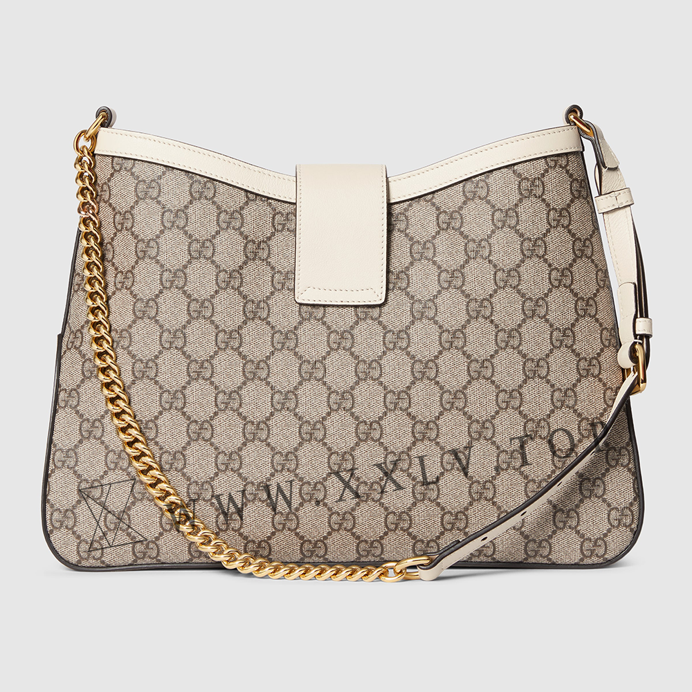 Drawing from the House’s origins as an artisanal luggage atelier, the Padlock closure features prominently on this shoulder bag in GG Supreme canvas. It is complete with gold-toned hardware, smooth white leather trim, a chain and leather shoulder strap.