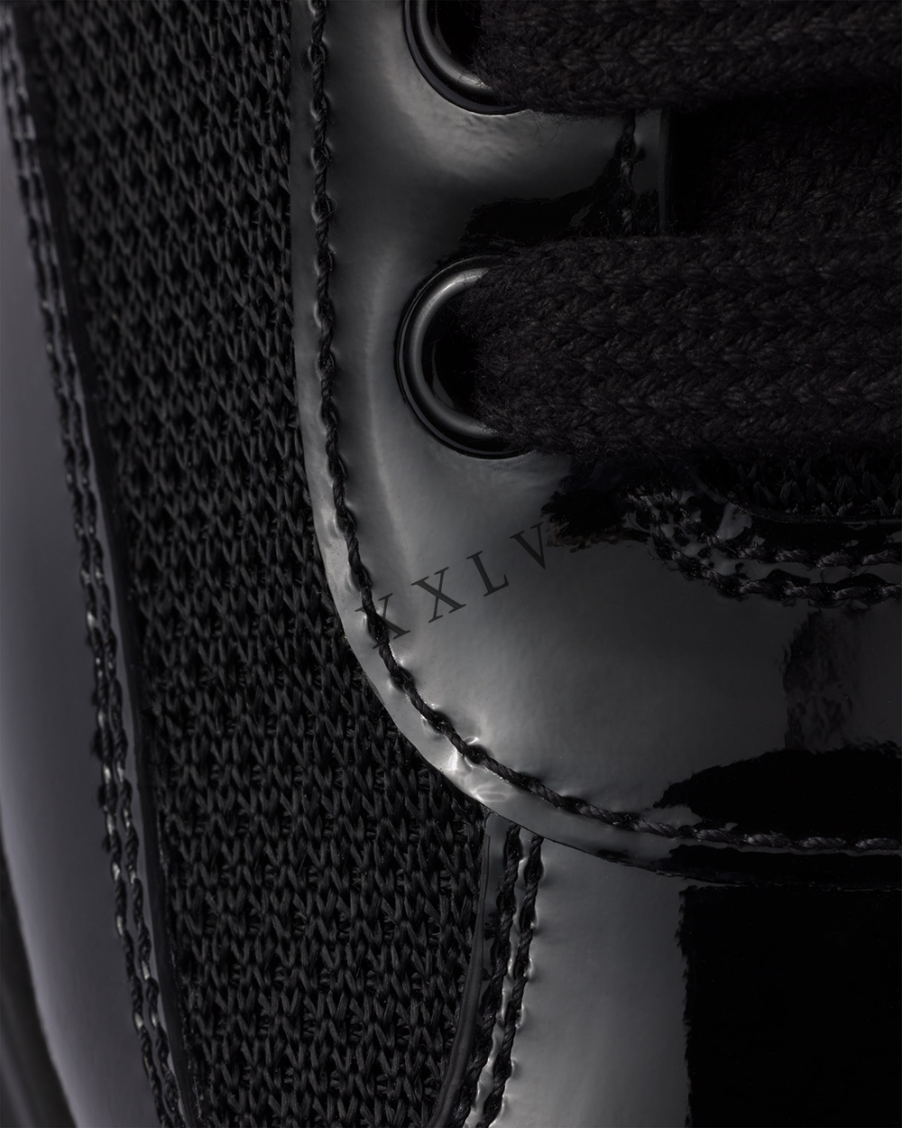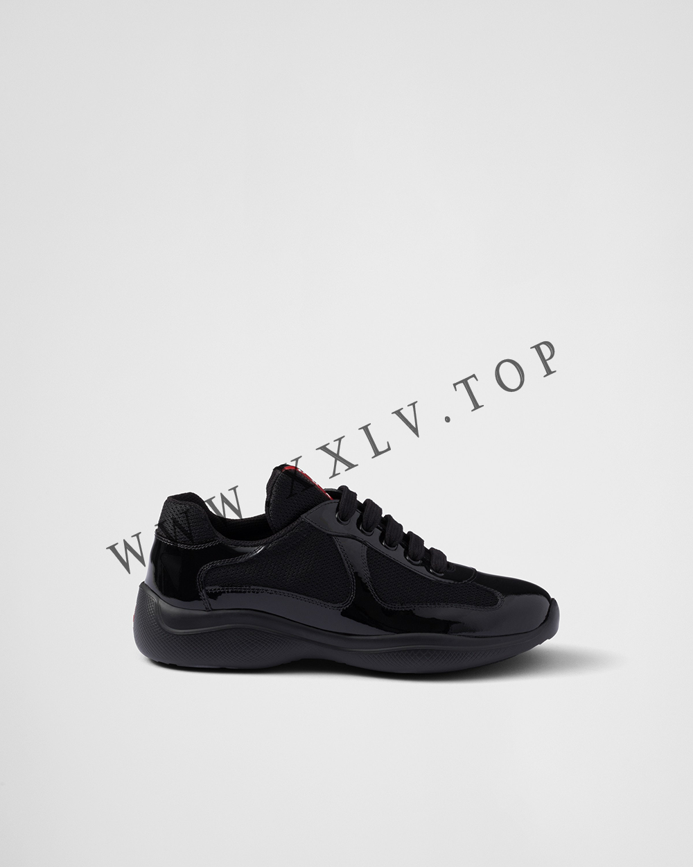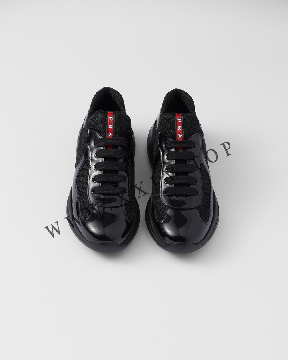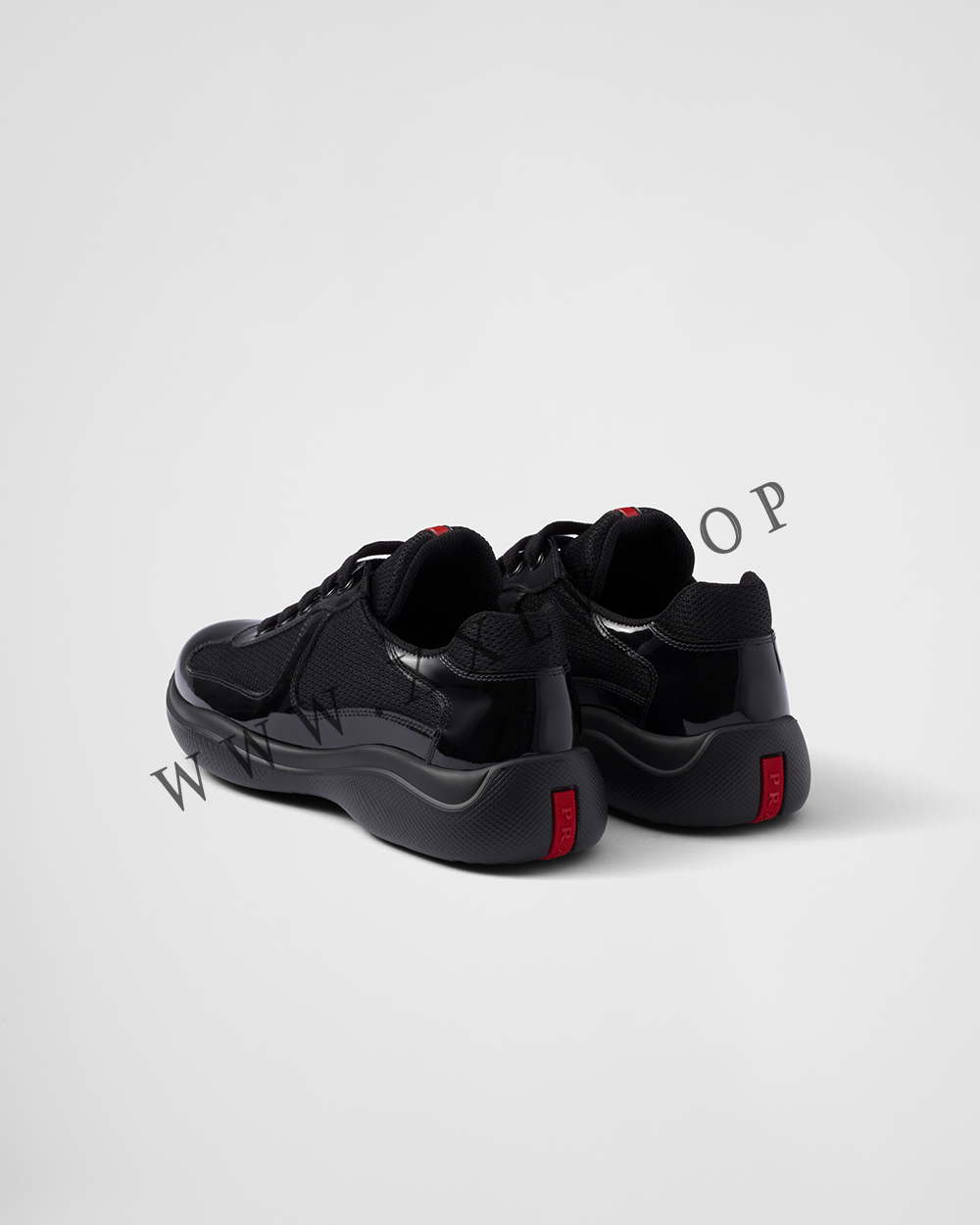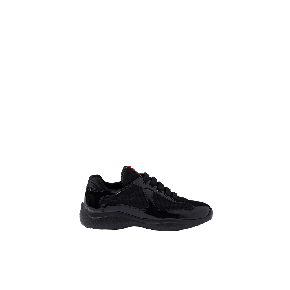 The iconic design of Prada America’s Cup combines timeless lines and innovative materials. Cotton laces and an optical patterned tread enhance the product decorated with the Prada Linea Rossa logo badge.