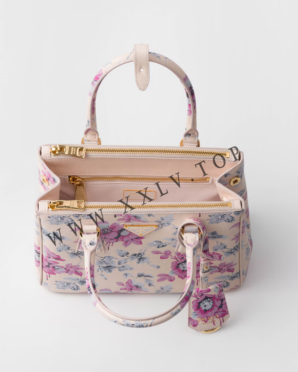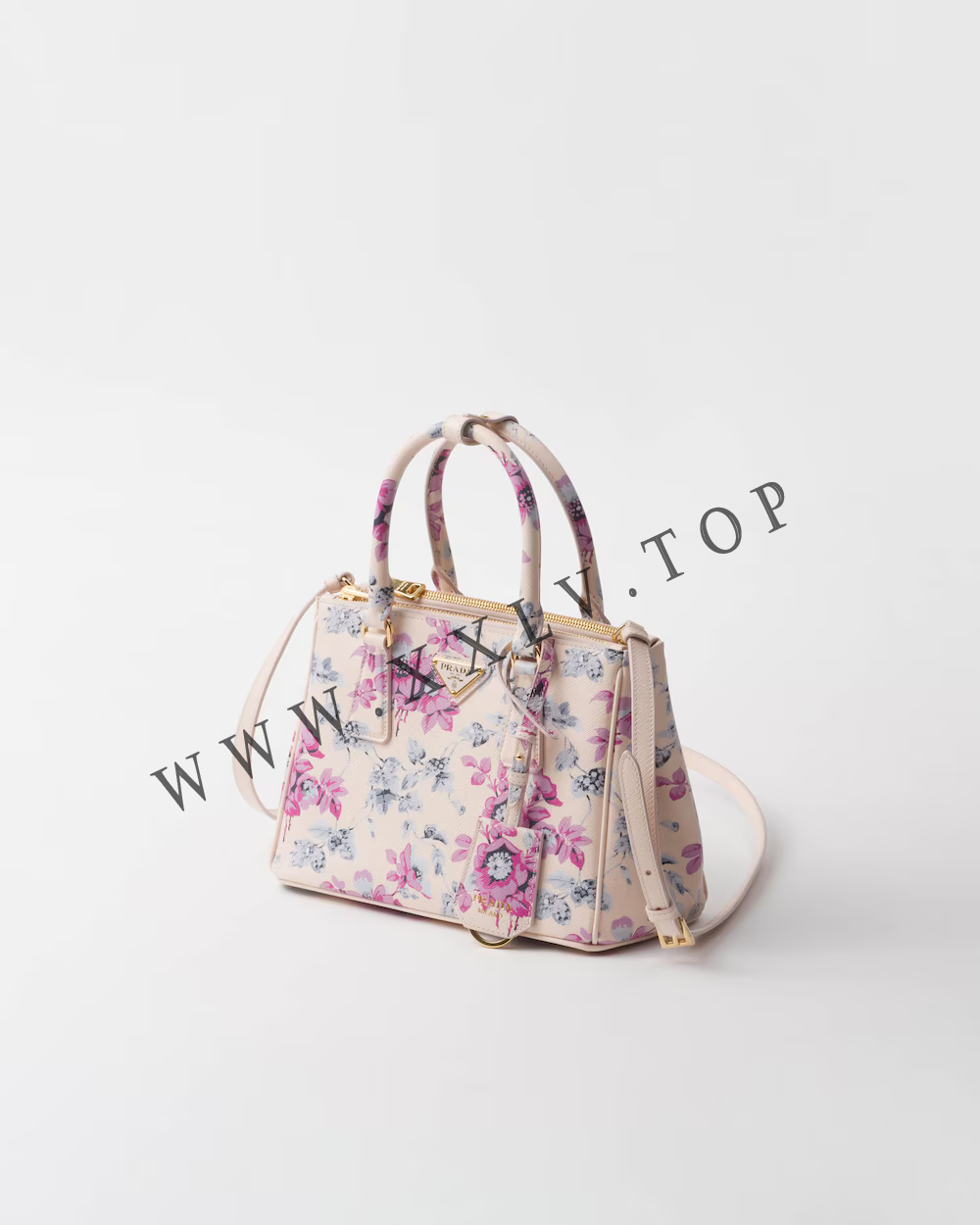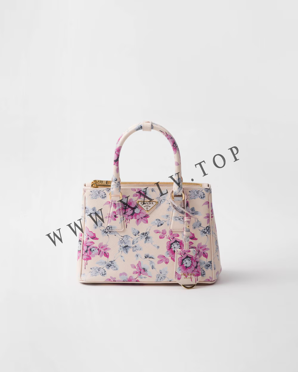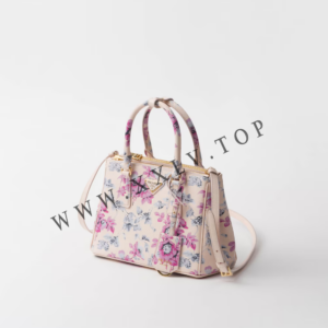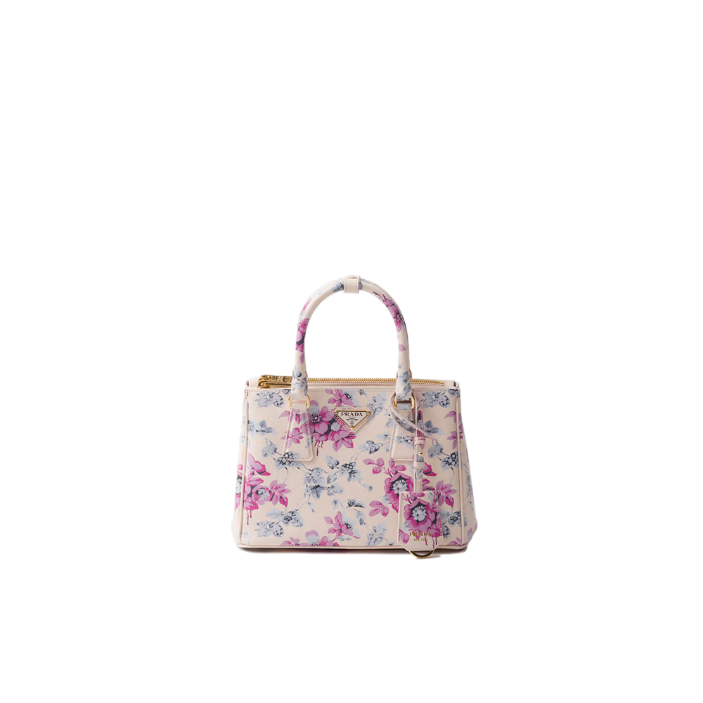 The sophisticated and timeless Prada Galleria bag blends industrial precision and the refined accuracy of craftsmanship in a design that celebrates the historic shop opened in the Galleria Vittorio Emanuele II of Milan in 1913. Consisting of more than 80 separate pieces assembled by hand, the style reveals a versatile and universal nature that makes it the perfect canvas for always new interpretations. The accessory, characterized by the iconic three pockets, features the distinctive crosshatch pattern with wax finish of Saffiano leather, animated by a romantic floral print that enhances the sleek and elegant silhouette.
