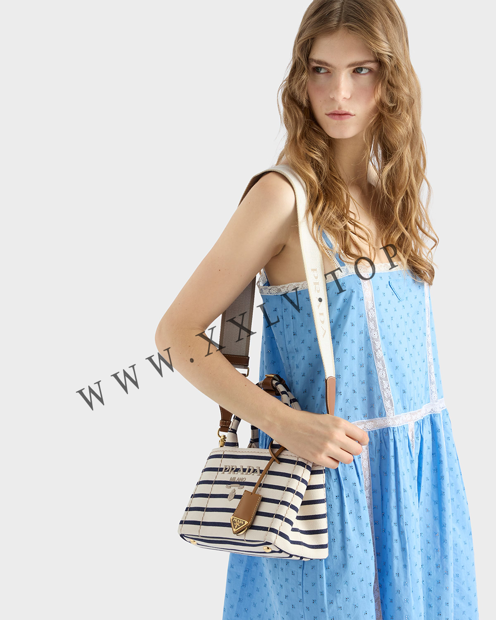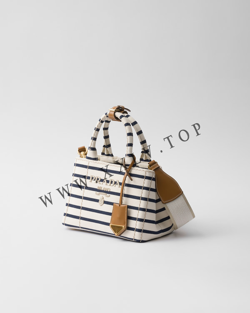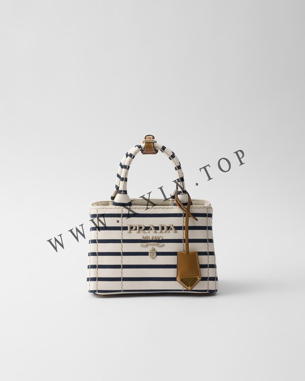 Timeless codes of nautical style inspire the design of this mini-bag, a reinterpretation of an iconic style. The accessory made of striped cotton canvas is completed with leather trim that underlines its refined, versatile character.
