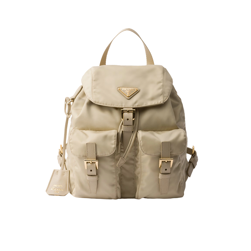 Prada’s functional and innovative backpack has redefined the traditional perception of luxury with a pragmatic but refined design. The iconic style is made of Re-Nylon, a regenerated nylon fabric that is the sustainable evolution of a distinctive material of the brand. The timeless silhouette, with roomy pockets and an elegant leather key ring, is decorated with the enameled metal triangle logo.