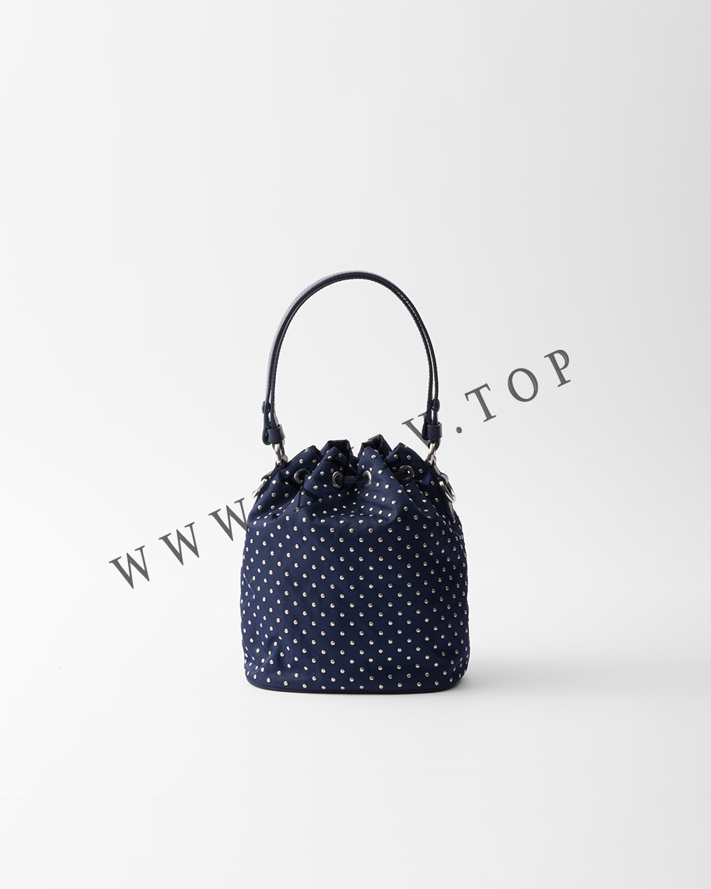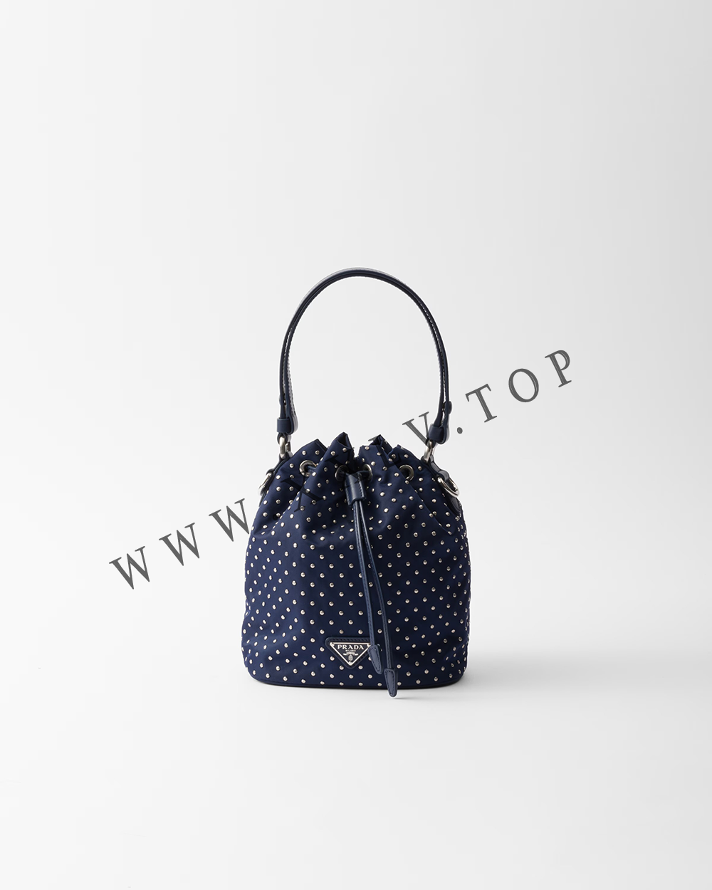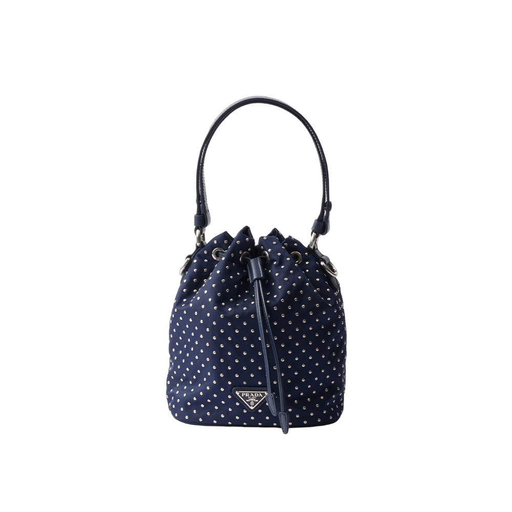 Inspired by an archive design, this mini-bag features a bucket bag silhouette and is crafted from Re-Nylon, an evolution of Prada’s iconic fabric. The refined silhouette is enriched with mini studs that add a contemporary edge to the accessory.
