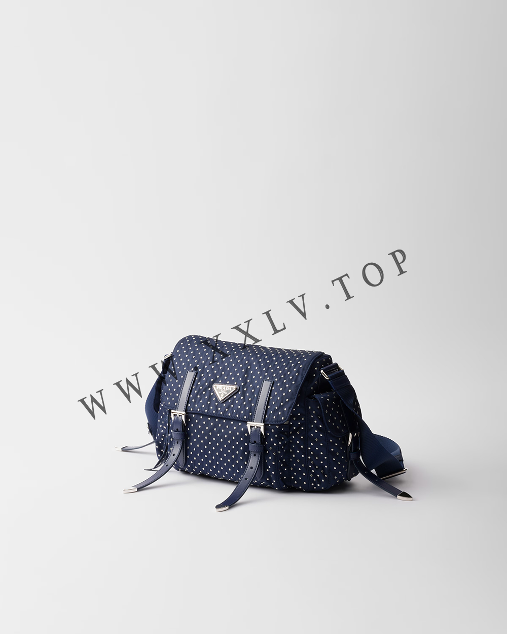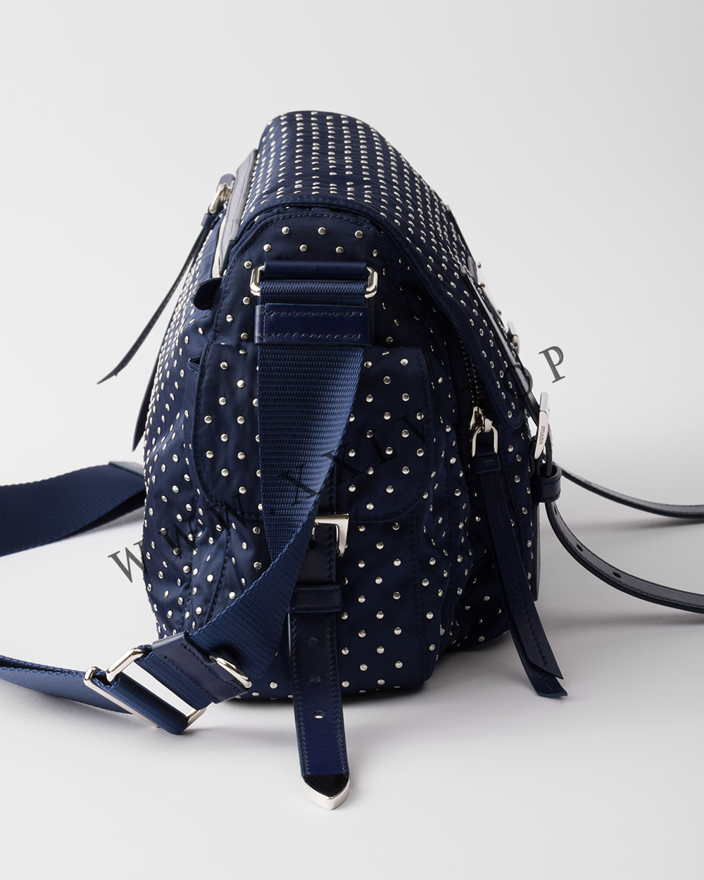This practical shoulder bag is crafted from Re-Nylon, an evolution of the iconic Prada nylon. Defined by an adjustable shoulder strap and multiple pockets, the design is enhanced with mini studs that add a contemporary and stylish touch.