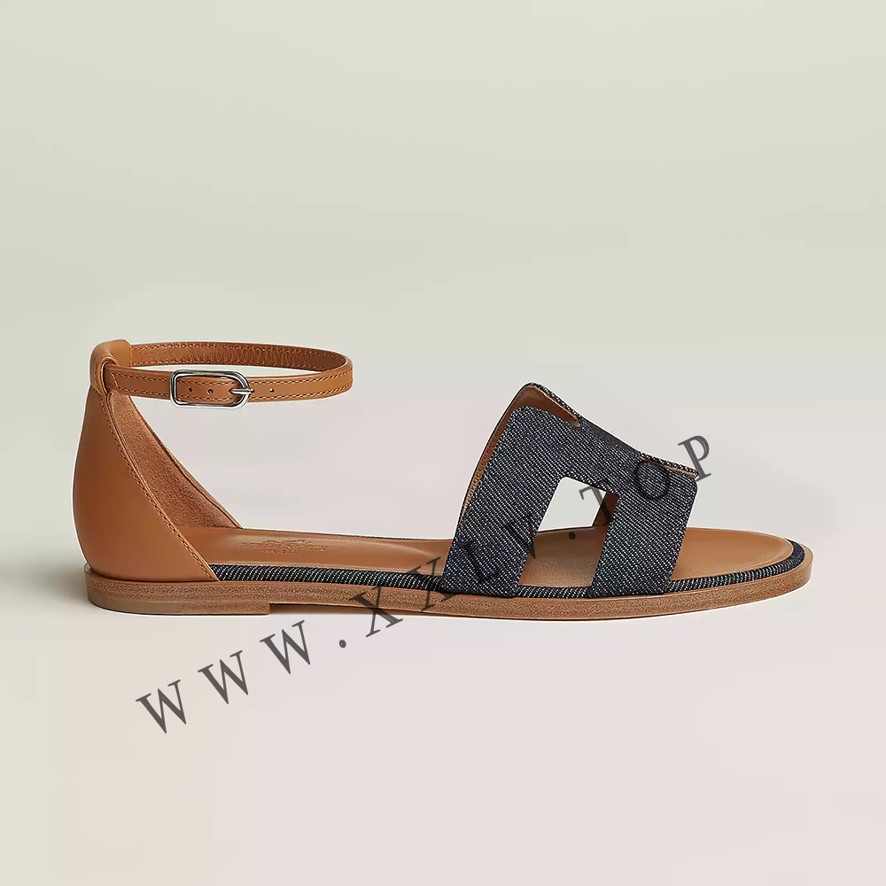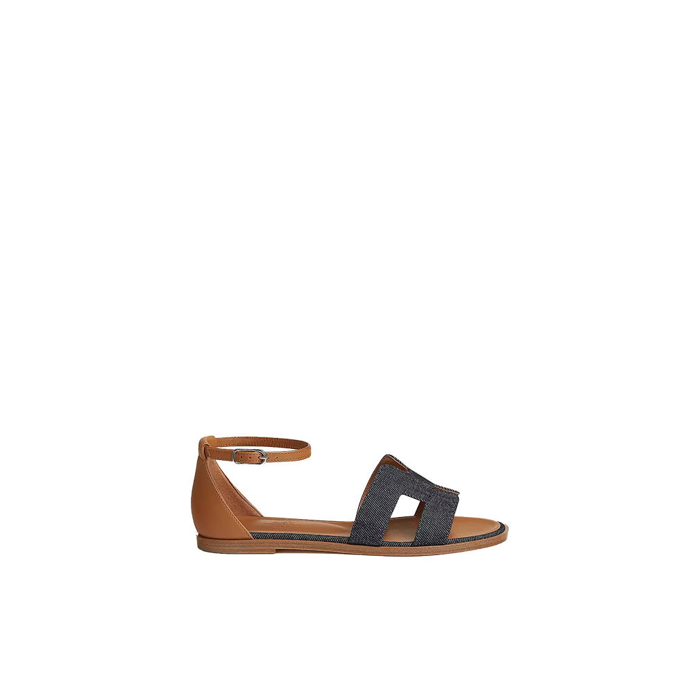Sandal in denim and calfskin with “H” cut-out detail and thin ankle strap.