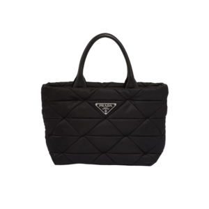 A geometric motif characterizes this quilted tote bag made of Re-Nylon, a fabric produced from recycled and purified plastic materials collected in the ocean. Accented with nappa leather handles and a removable woven tape shoulder strap, the accessory is decorated on the front with the iconic enameled triangle logo.