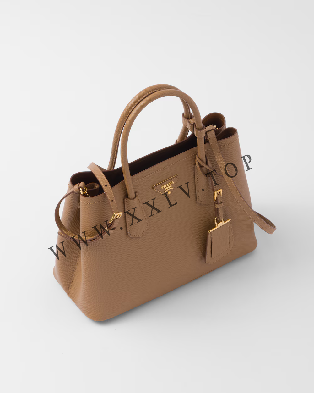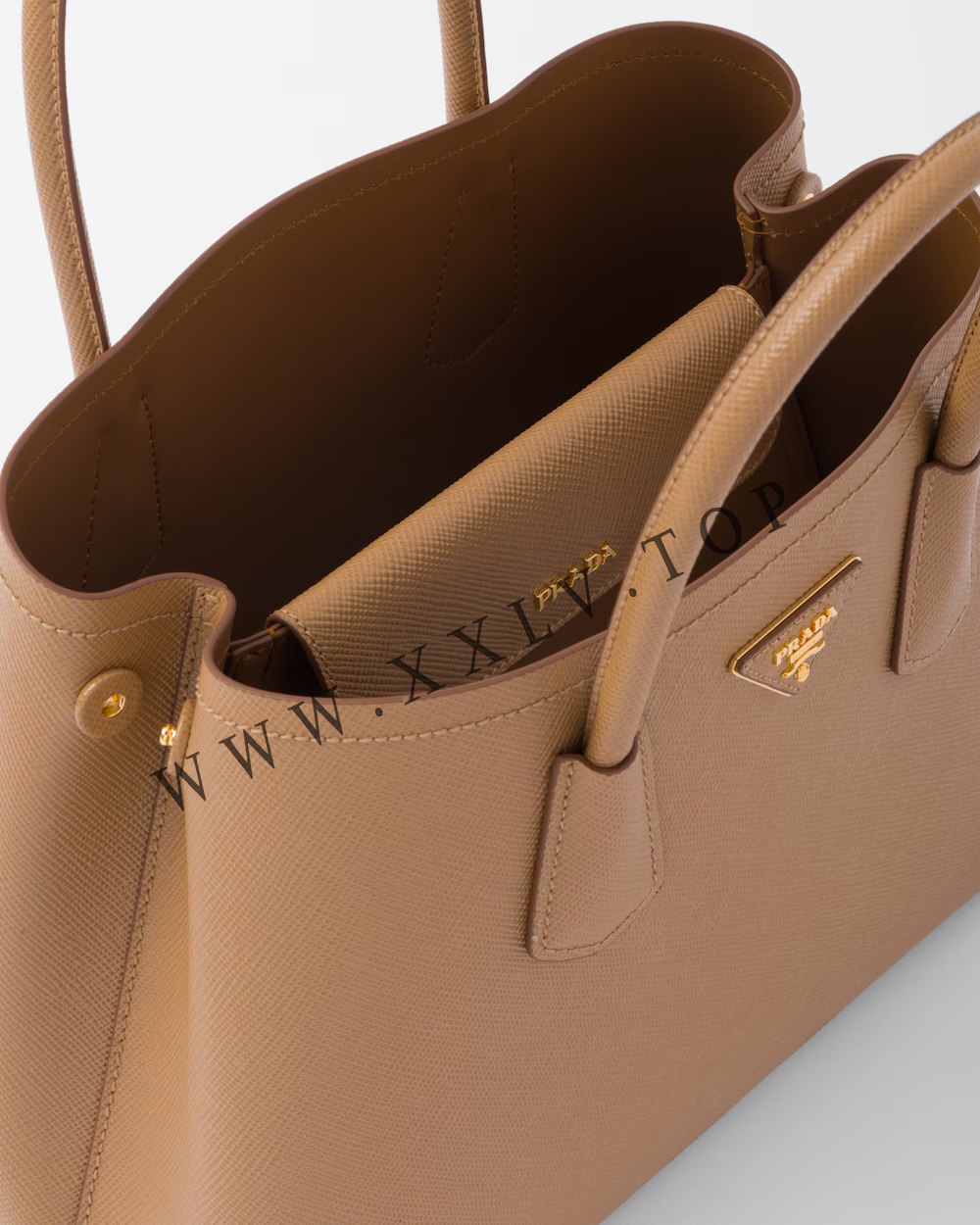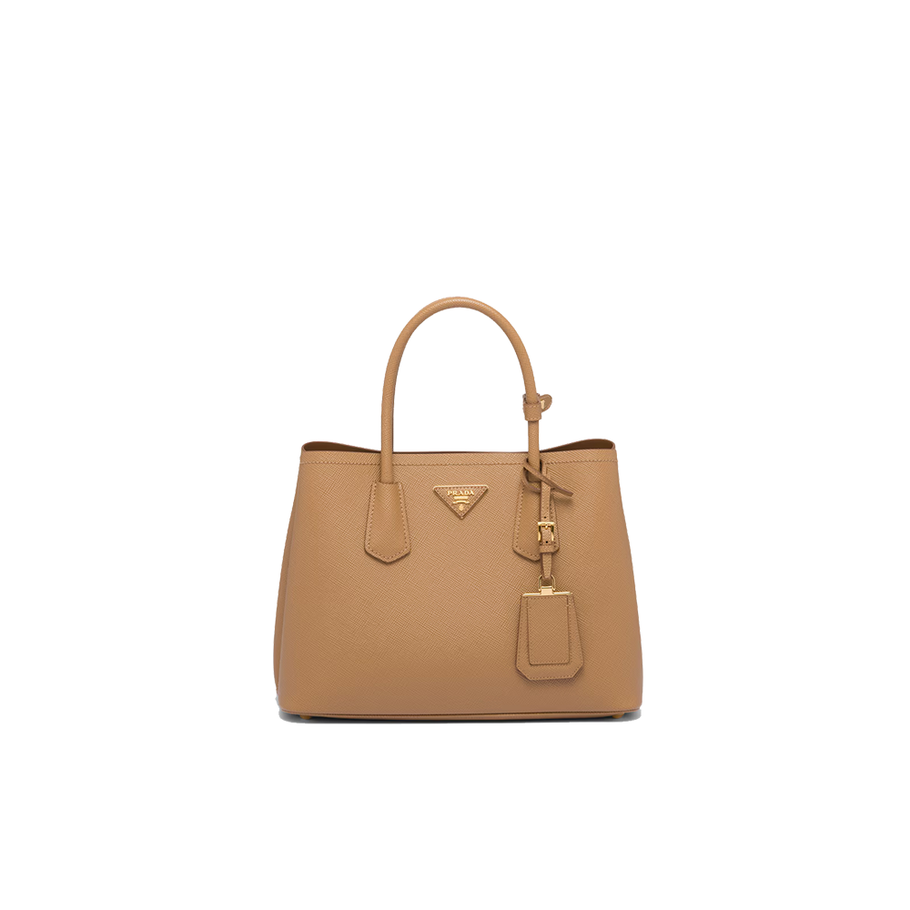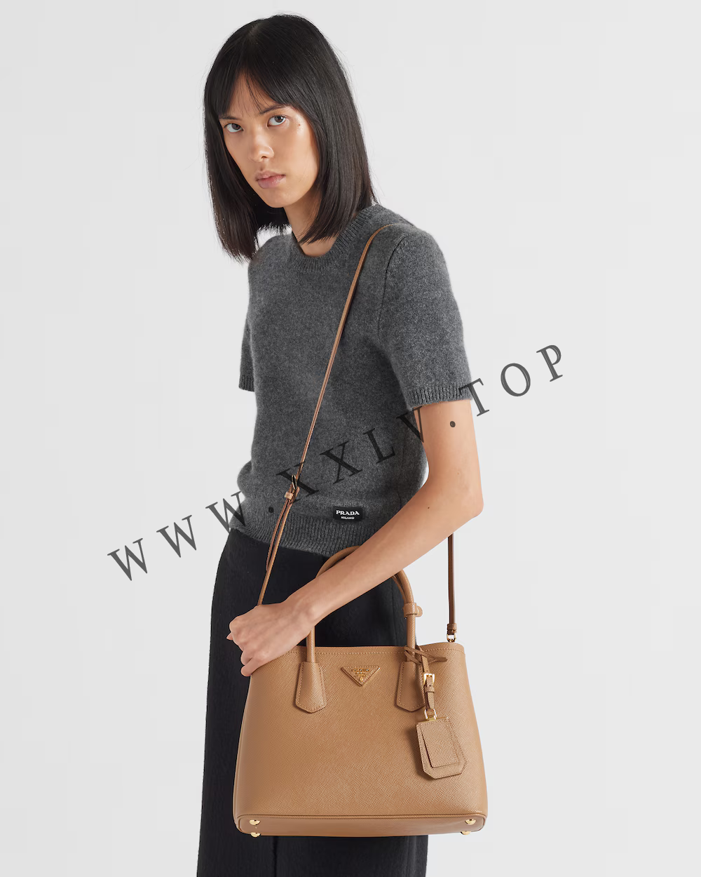 The Prada Double bag in Saffiano Cuir leather comes with a double handle and detachable shoulder strap. A flap pocket inside and lettering logo distinguish the bag with a nappa leather lining.