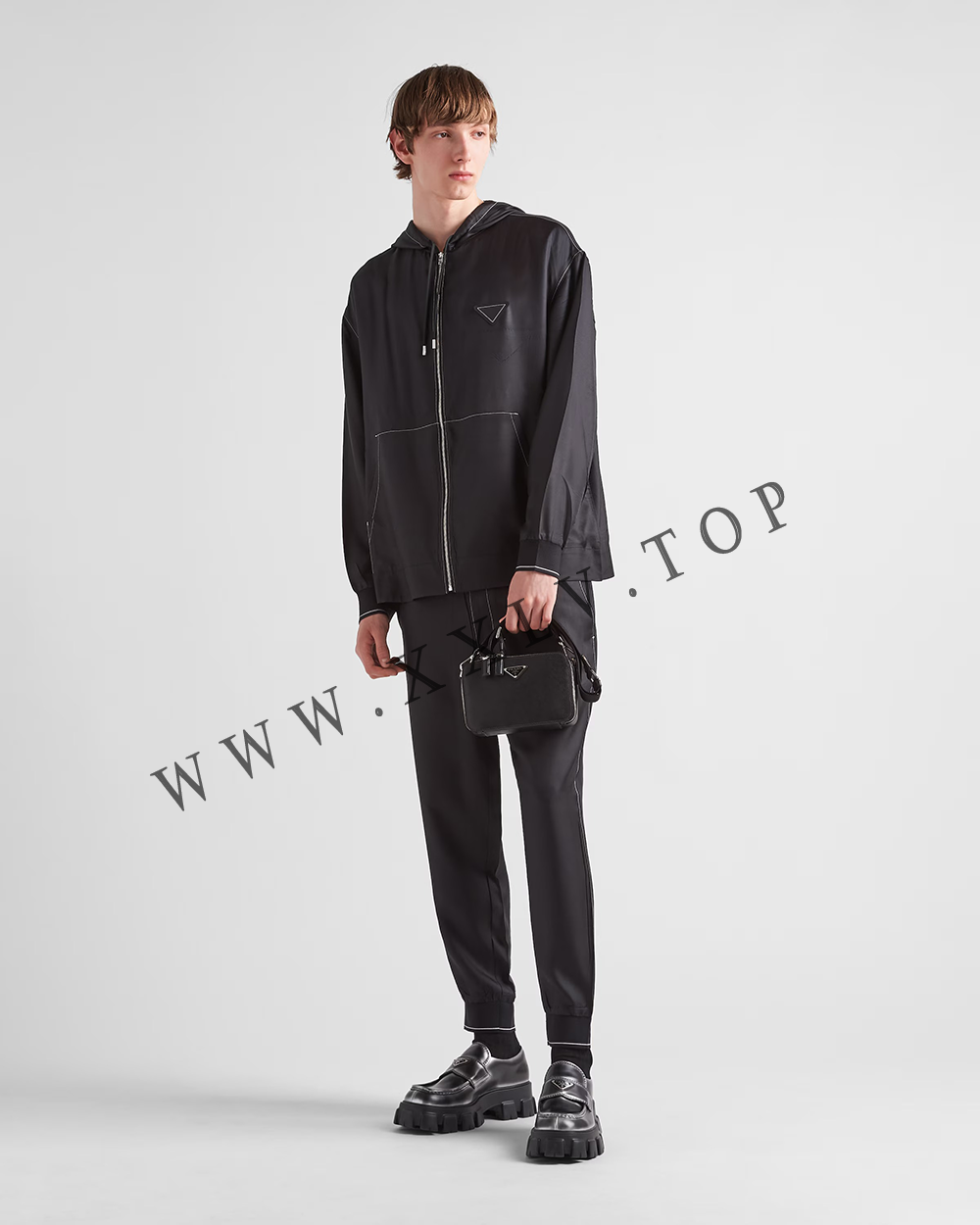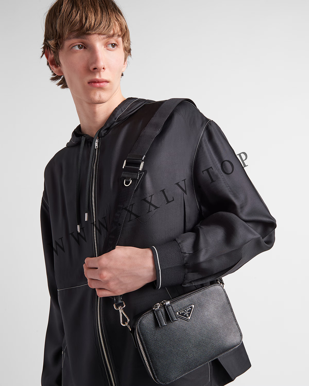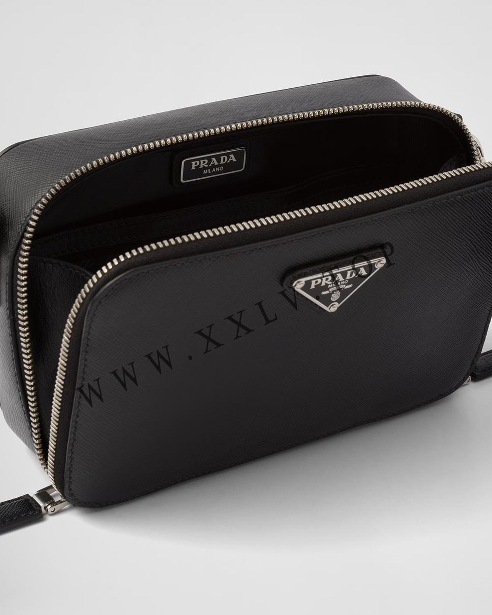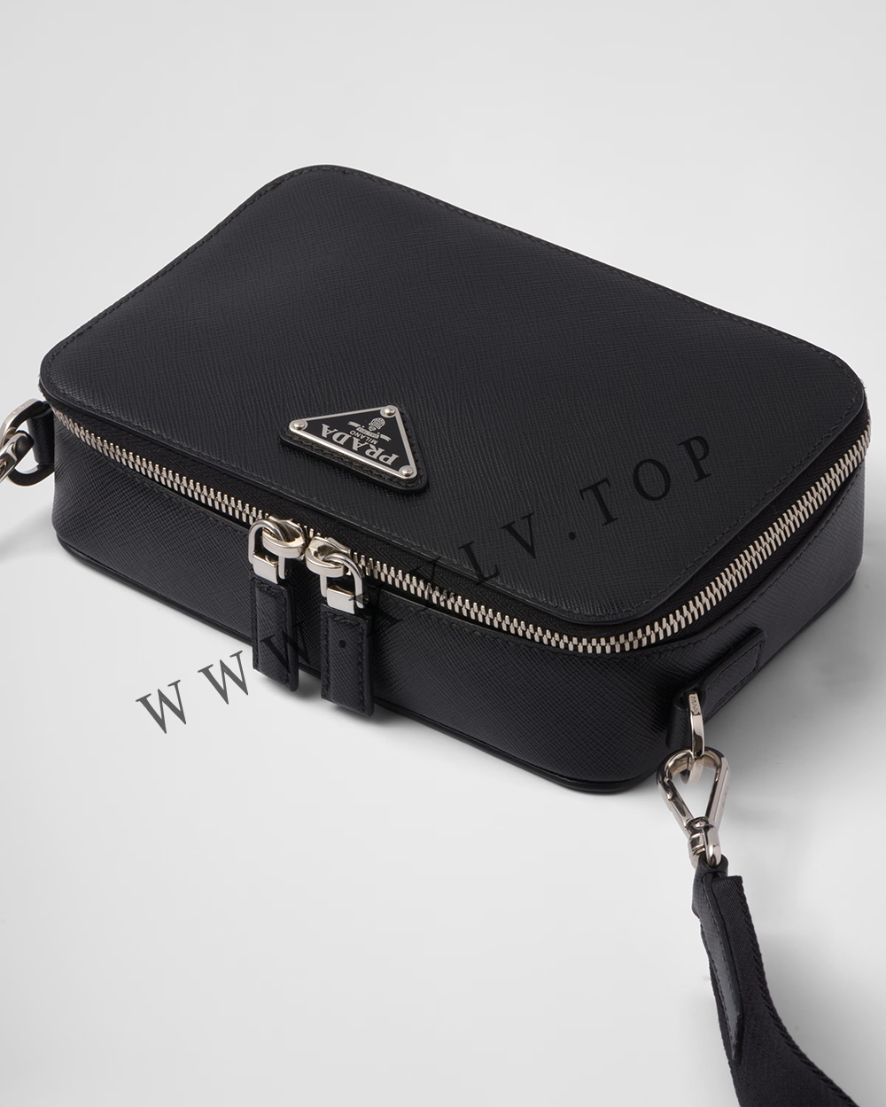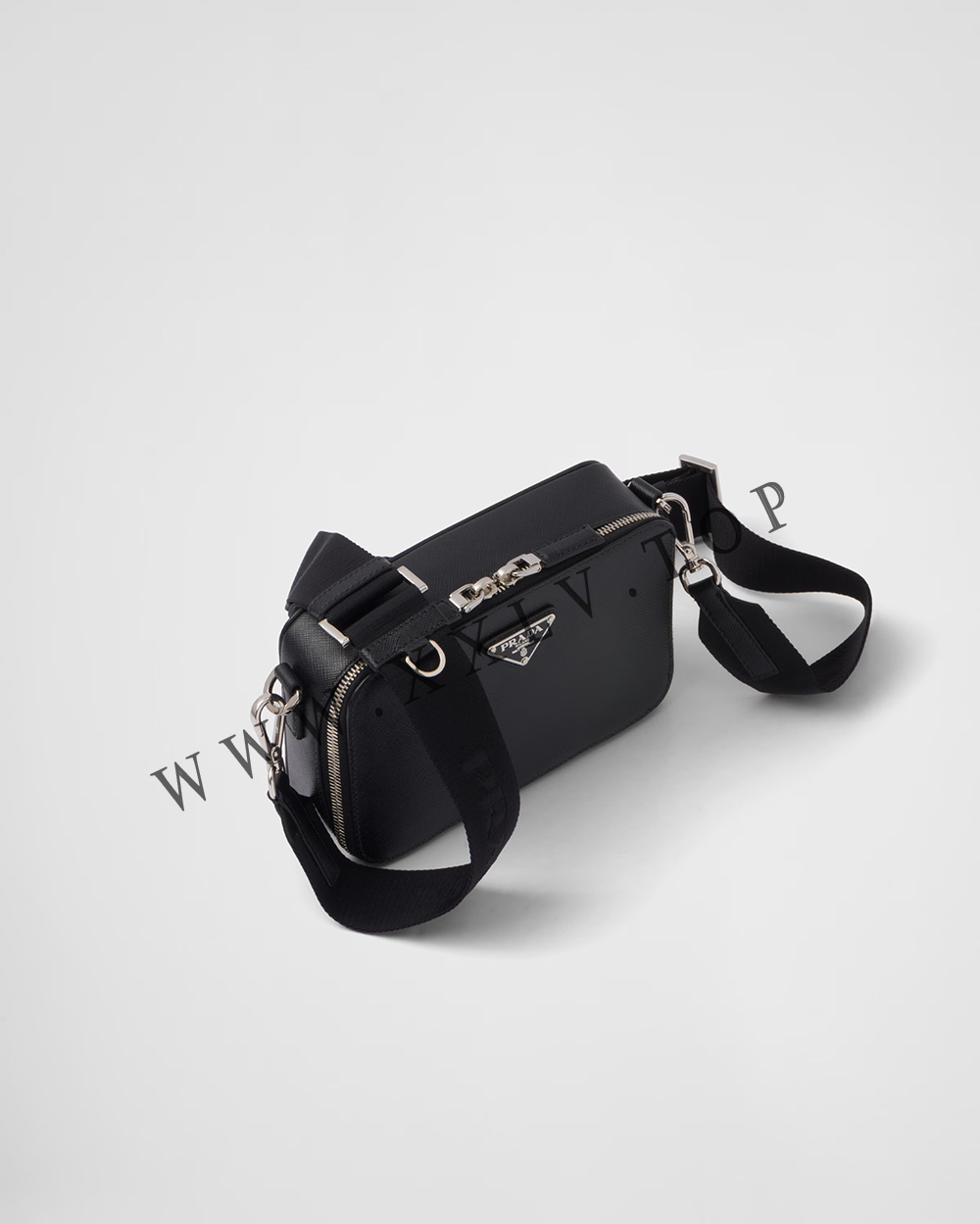 This contemporary bag with sleek lines has a leather handle and detachable adjustable woven nylon tape shoulder strap that adds lightness and versatility to the accessory. Saffiano leather, an iconic Prada material with a crosshatch pattern and wax finish, is synonymous with luxury and identifies with traditional Italian leather goods production. The triangle logo first introduced on trunks designed by Mario Prada decorates this accessory, a perfect combination of elegance and practicality.