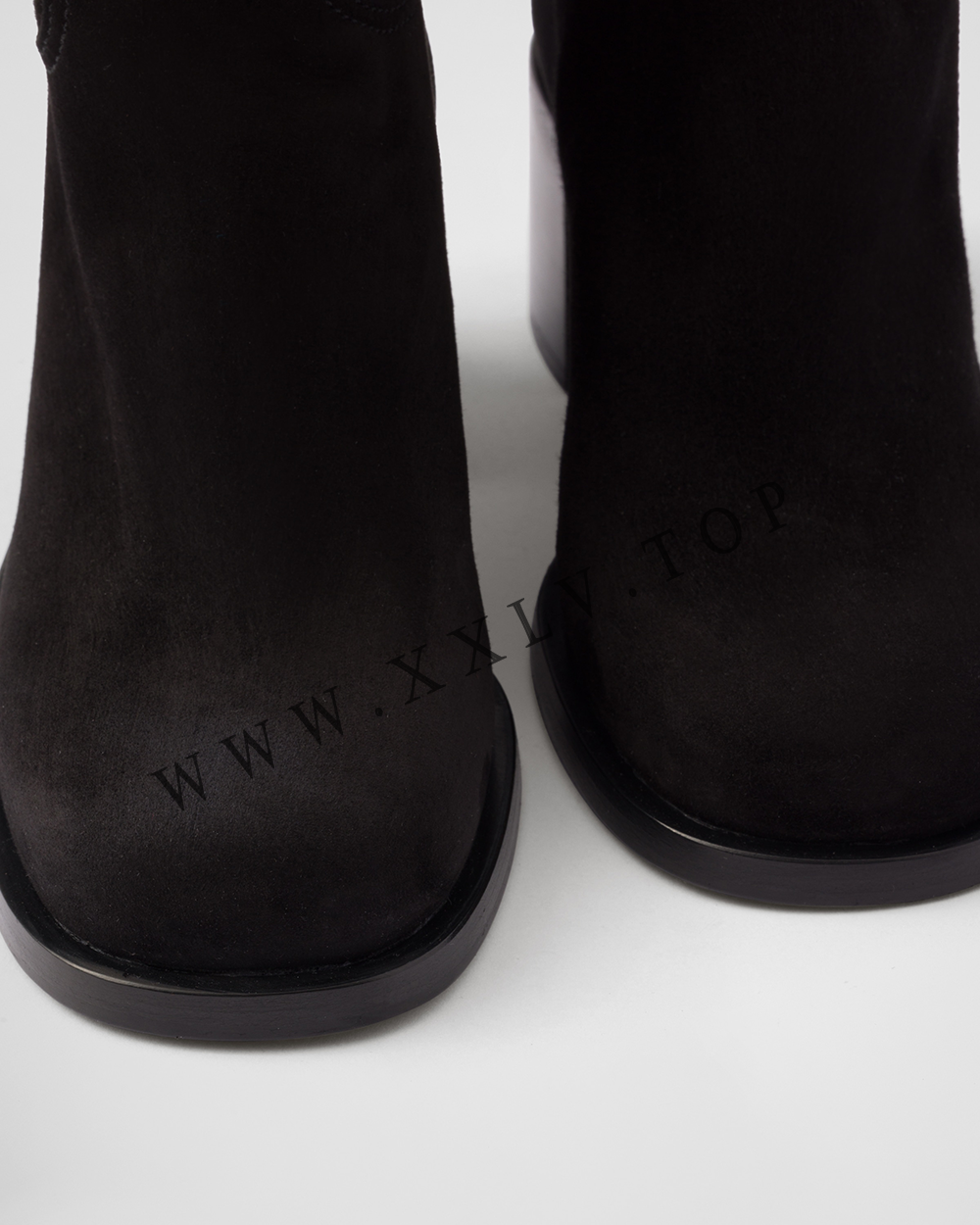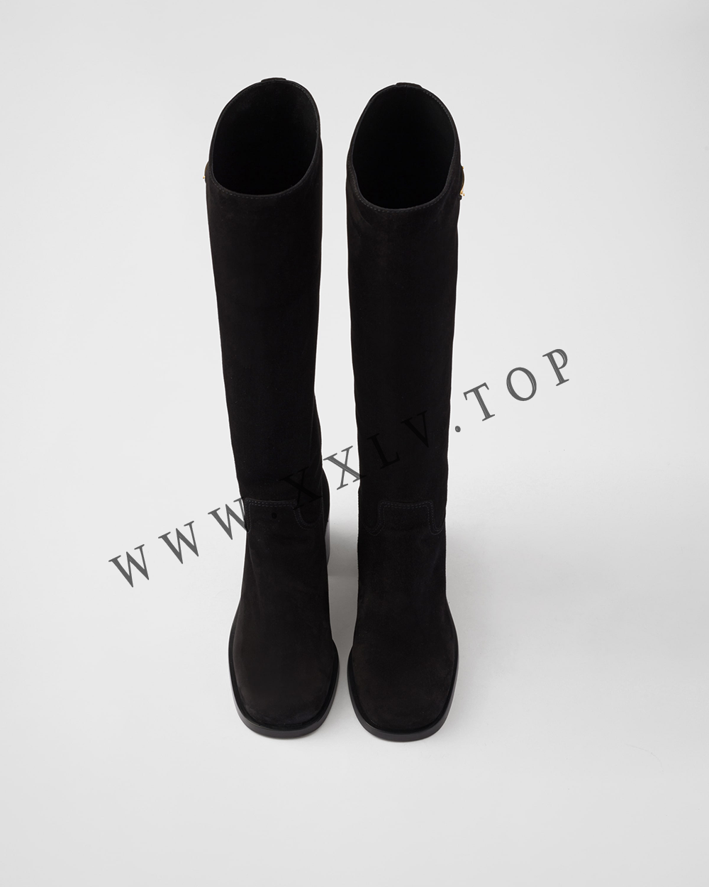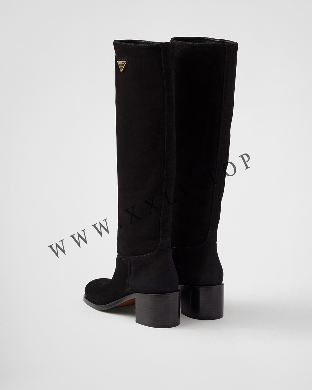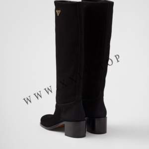 These knee-high boots characterized by the silky touch of suede feature timeless, classic lines. The enameled metal triangle logo completes the footwear with an iconic, elegant touch.