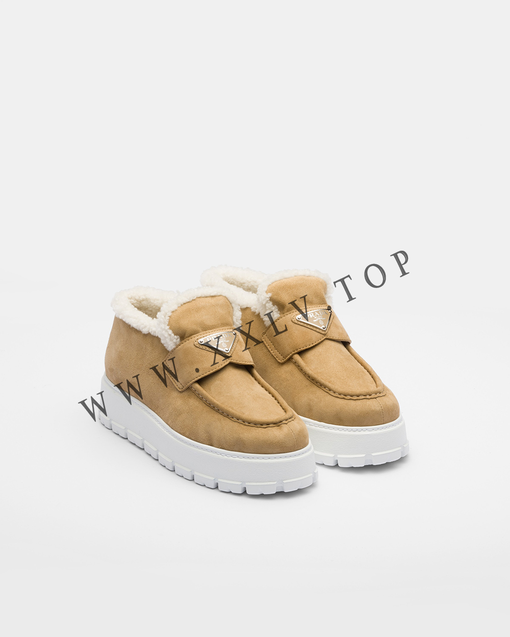 These suede loafer booties with shearling lining recall winter footwear and are embellished with the enameled metal triangle logo.