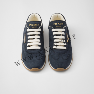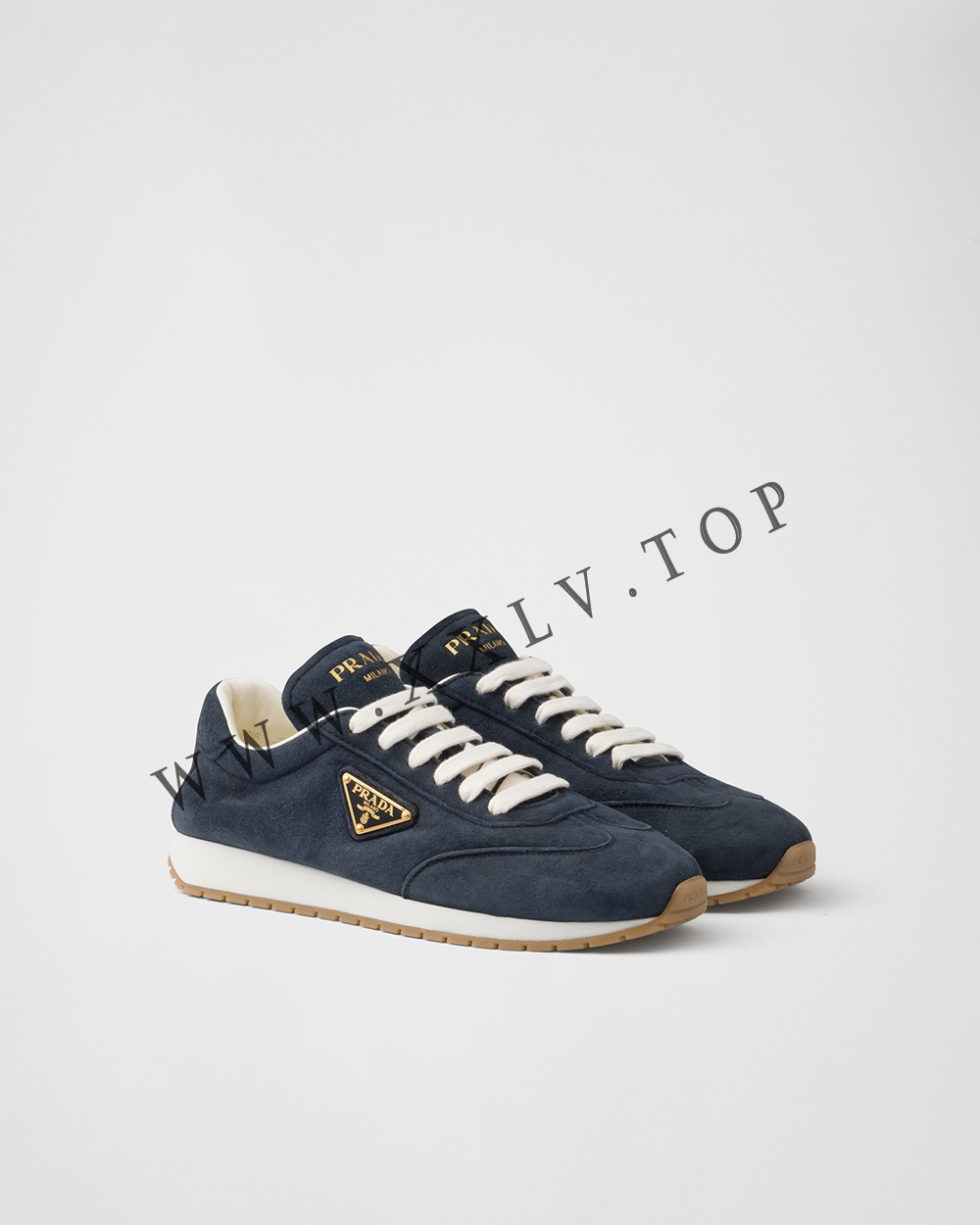 These sneakers with a sporty silhouette are made of suede and have a light, comfortable rubber sole. The versatile style is completed by the enameled metal triangle logo that embellishes the upper.