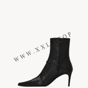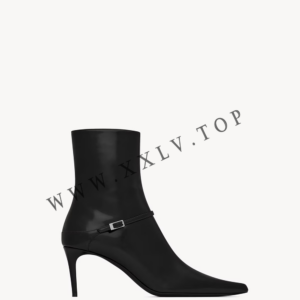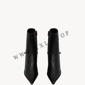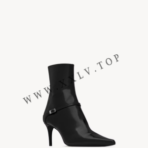 ankle boots with a pointed toe and stiletto heel, decorated with a buckle strap at the ankle.